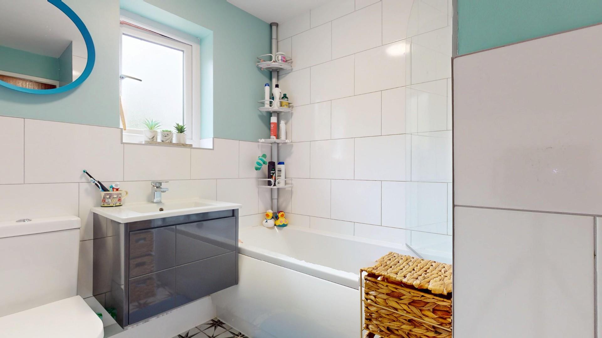 Refurbished with a modern white suite comprising panelled bath with glazed screen, high output shower over with monsoon style head, wall mounted vanity with shaped bowl, low level WC, part tiled walls, double glazed window, tile effect floor finish, chrome towel radiator.