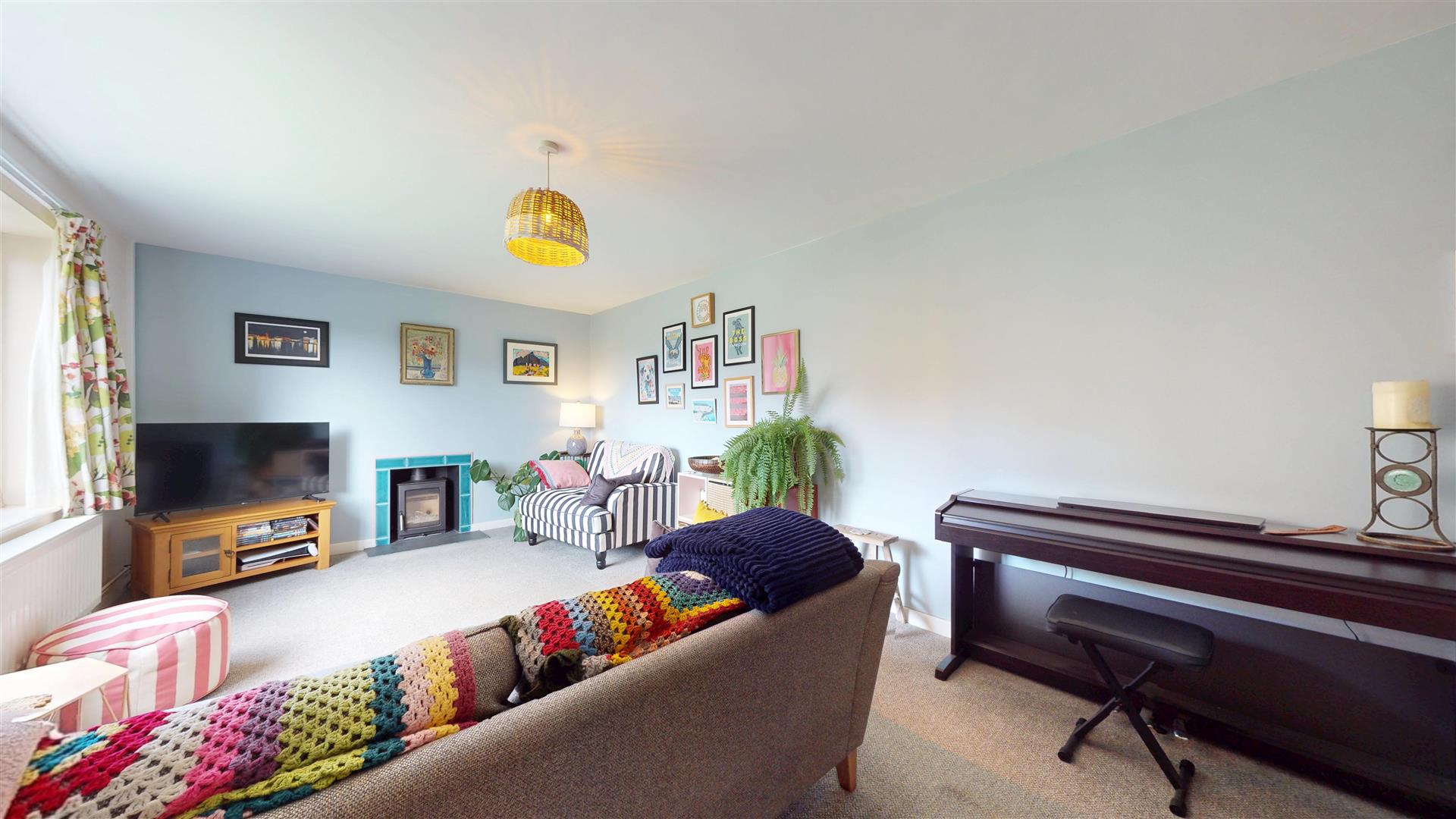 Wide double glazed window to front, inset fireplace with decorative tiled surround and hearth with a modern wood burning stove, TV point, panelled radiator.