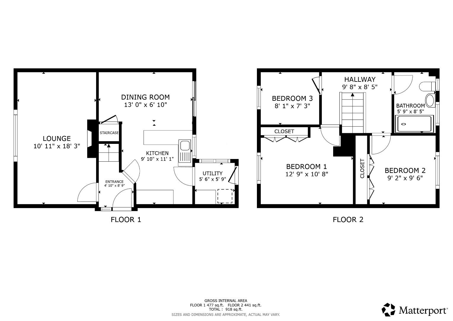 Imperial: 11’1″ x 9’10” and 13′ x 6’10”