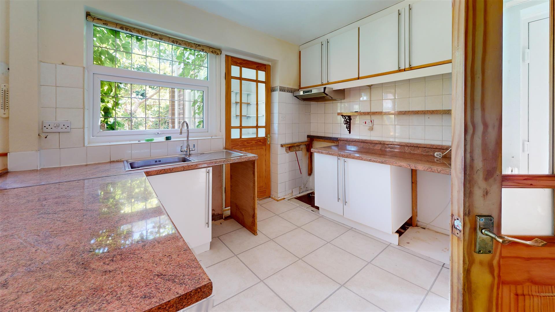 Fitted base unit with void and plumbing for washing machine, modern Worcester wall mounted gas fired combination boiler, single glazed window, double glazed door to rear.