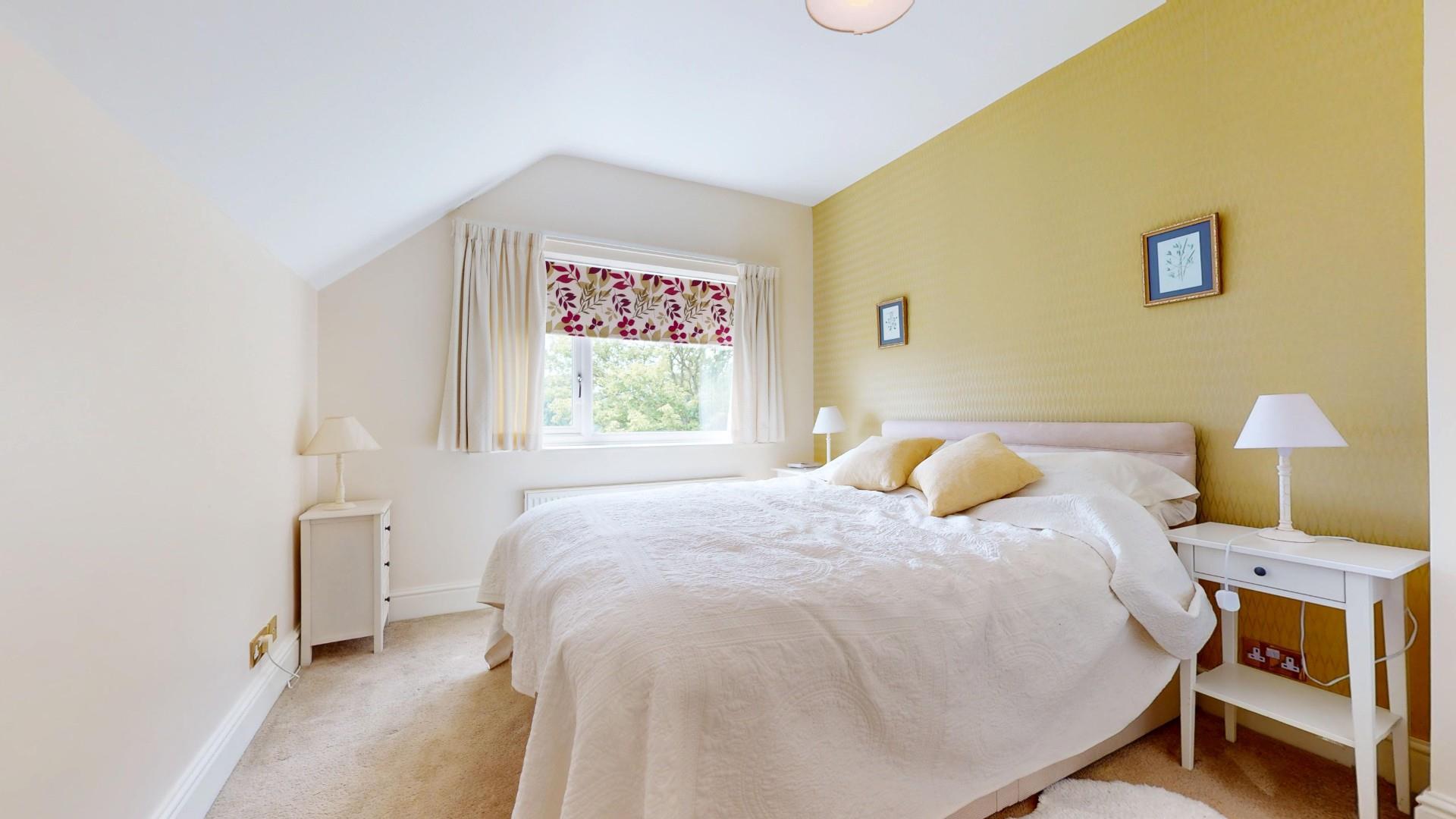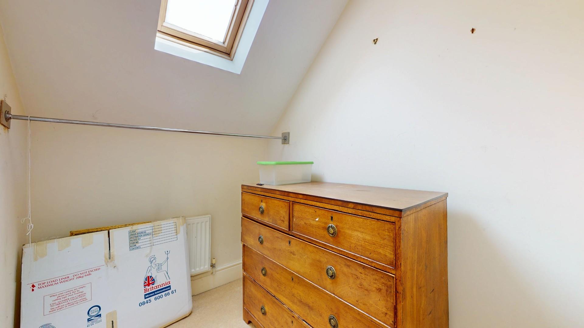 A large double room with high vaulted ceiling, double glazed window to front, walk-in wardrobe with Velux roof light, radiator.