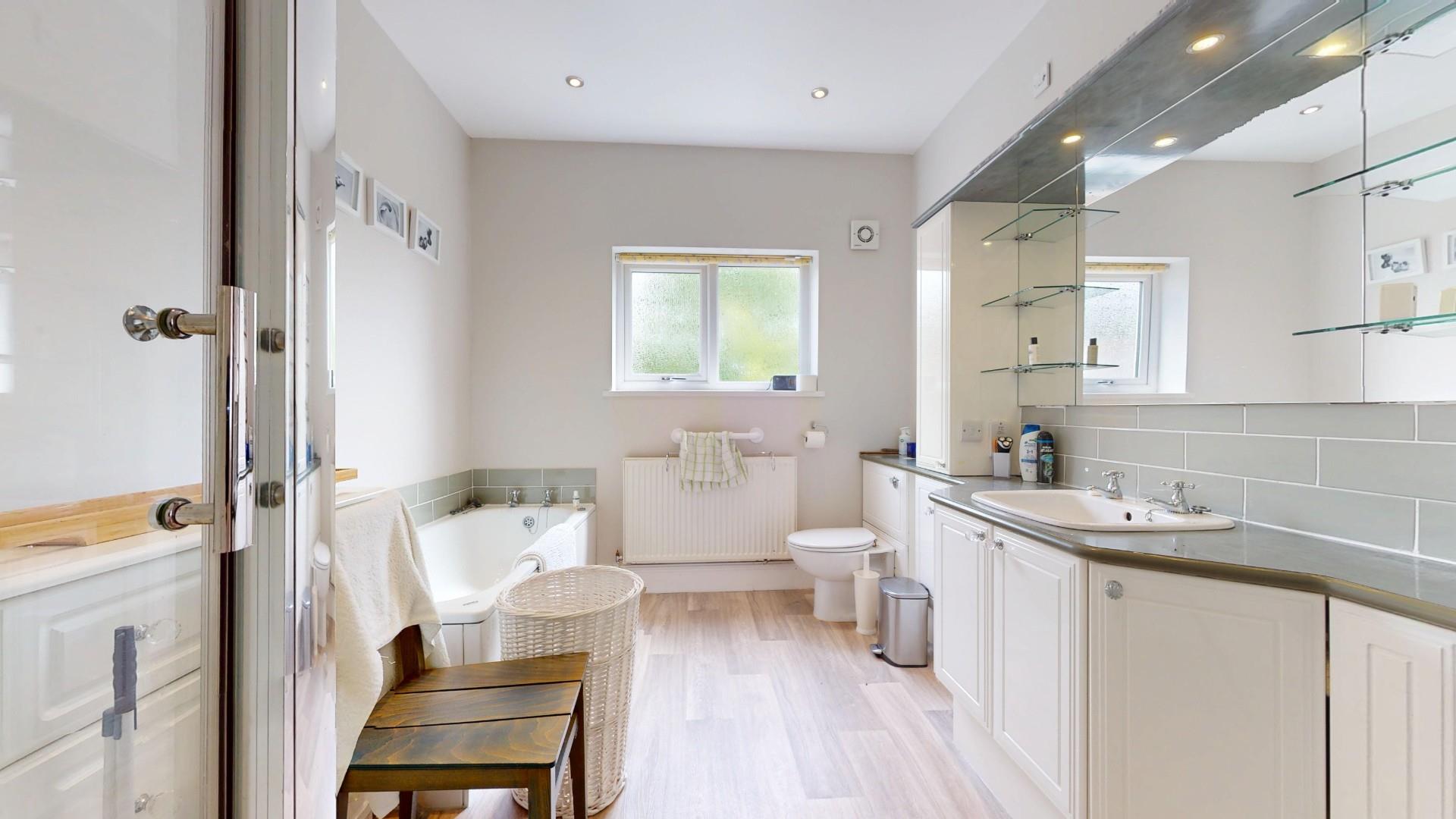 Panelled bath, separate walk-in shower cubicle with glazed screen and shower with monsoon style head, fitted cabinet to one wall providing a dresser style unit with inset bowl, fitted cabinets, mirrors, shelving and pelmet lighting, low level WC, extractor fan, panelled radiator.