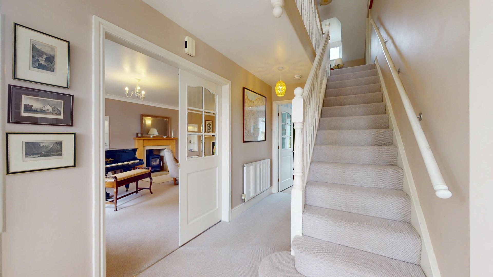 Staircase rising off with enclosed understairs cupboard, panelled radiator.