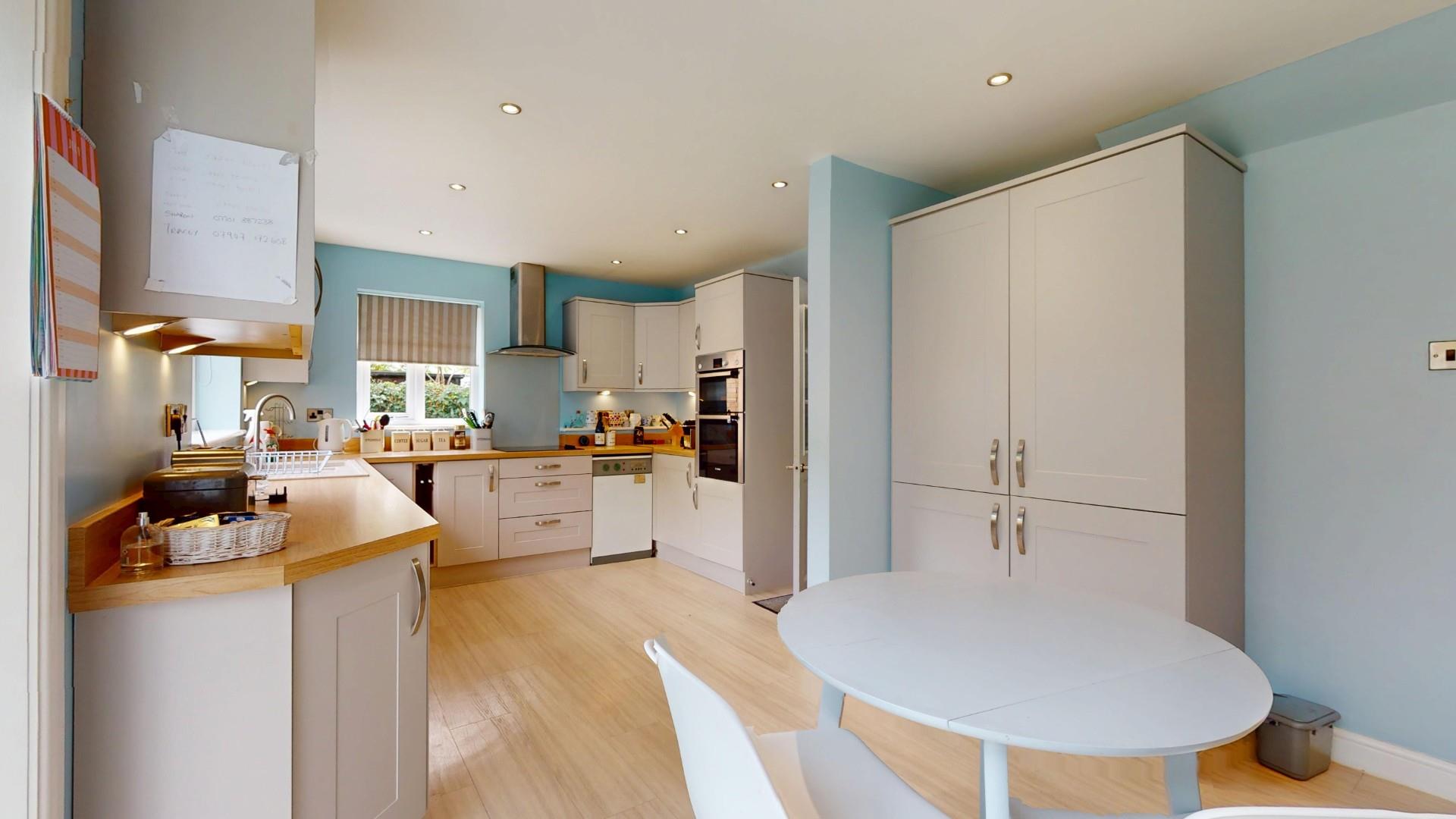 The kitchen has been refurbished with a contemporary range of base and wall mounted cupboards and drawers with a light grey toned finish to door and drawer fronts and contrasting woodgrain effect working surfaces to include an inset one and half bowl composite sink with drainer and mixer tap, integrated four ring electric hob with stainless steel and glass hood above, glass upstand, integrated Bosch double oven, dishwasher, fridge/freezer, pantry cupboard. Ceiling downlighters, modern vertical column radiator, Worcester oil fired combination boiler providing heating and hot water. Square opening to conservatory.