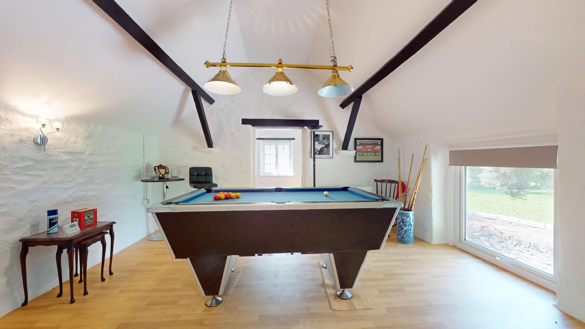 The coach house is a substantial mainly stone built range providing three rooms to the ground floor, namely a garage, stables and garden stores. There is a spiral staircase leading up to a converted first floor also providing three rooms presently used as a games room, home office and bar.