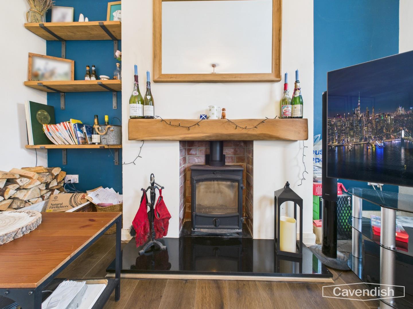 To the right, the living room is a warm and inviting space, enjoying a large double-glazed window to the front elevation and a further side window allowing plenty of natural light. The room features wood-effect flooring, ceiling lighting, and a characterful brick-built fireplace with wood burning stove with wooden mantel and slate hearth, creating an ideal space to relax and unwind.