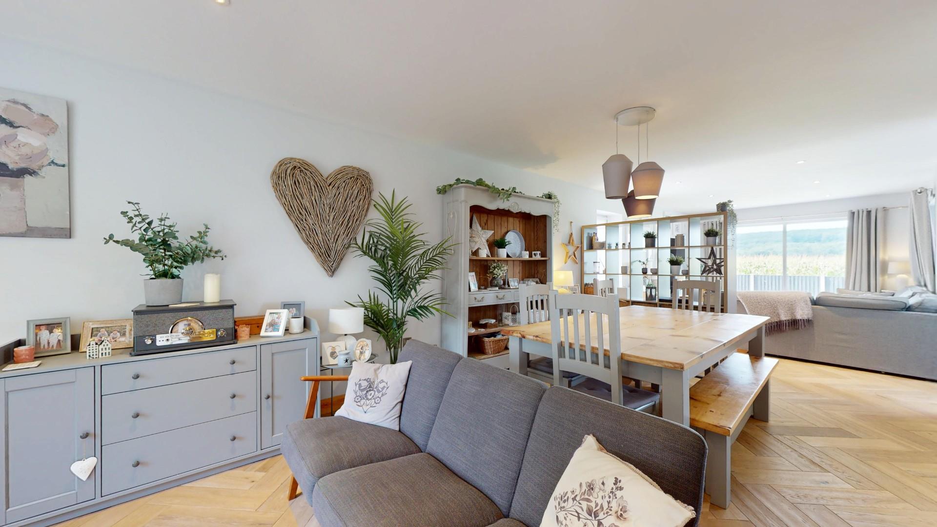 A BEAUTIFULLY APPOINTED FOUR/FIVE BEDROOM DETACHED DORMER HOUSE comprehensively remodelled and extended to exacting standards to provide a unique family home. This unique family home was effectively rebuilt to include the installation of underfloor heating throughout the ground floor and very much designed to take full advantage of the delightful westerly views over adjoining farmland towards Ruthin castle and rolling countryside. It affords entrance porch, L-shaped reception hall, large open plan and versatile through lounge/dining room and day room with adjoining luxury fitted kitchen, utility room, study and cloakroom, first floor landing, stunning master bedroom with picture window and Juliet balcony affording far reaching westerly views together with fitted wardrobes and en suite shower room, three further bedrooms together with study room and luxury bathroom. Tarmacadam driveway with integral garage and store room. Enclosed westerly facing lawned gardens to rear with wide patios, large pergola. Inspection highly recommended.