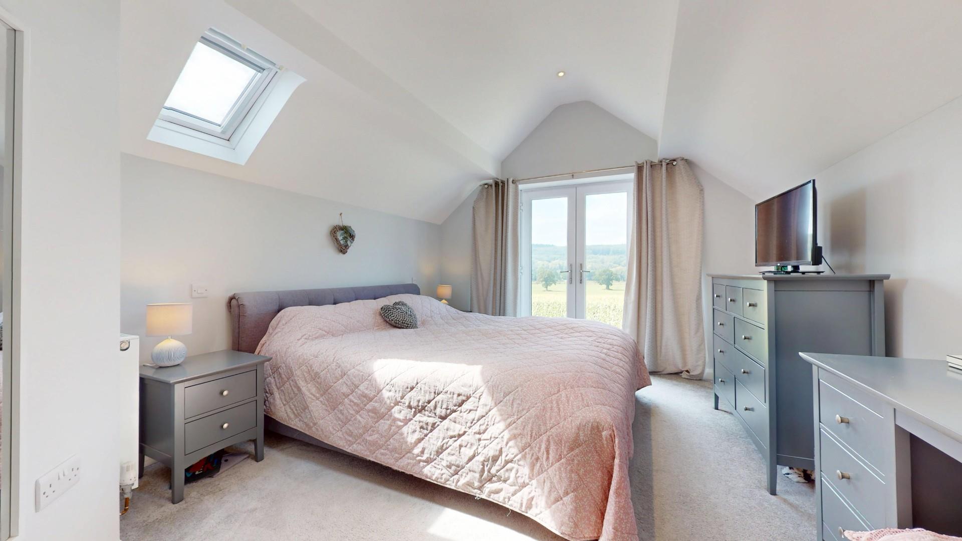 A splendid room designed to take full advantage of the far reaching westerly views across farmland and wooded countryside, it has a high vaulted ceiling with downlighters, two Velux roof lights, two double glazed doors with matching panels to either side opening to a Juliet balcony, two panelled radiators, three outbuilt double door wardrobes.