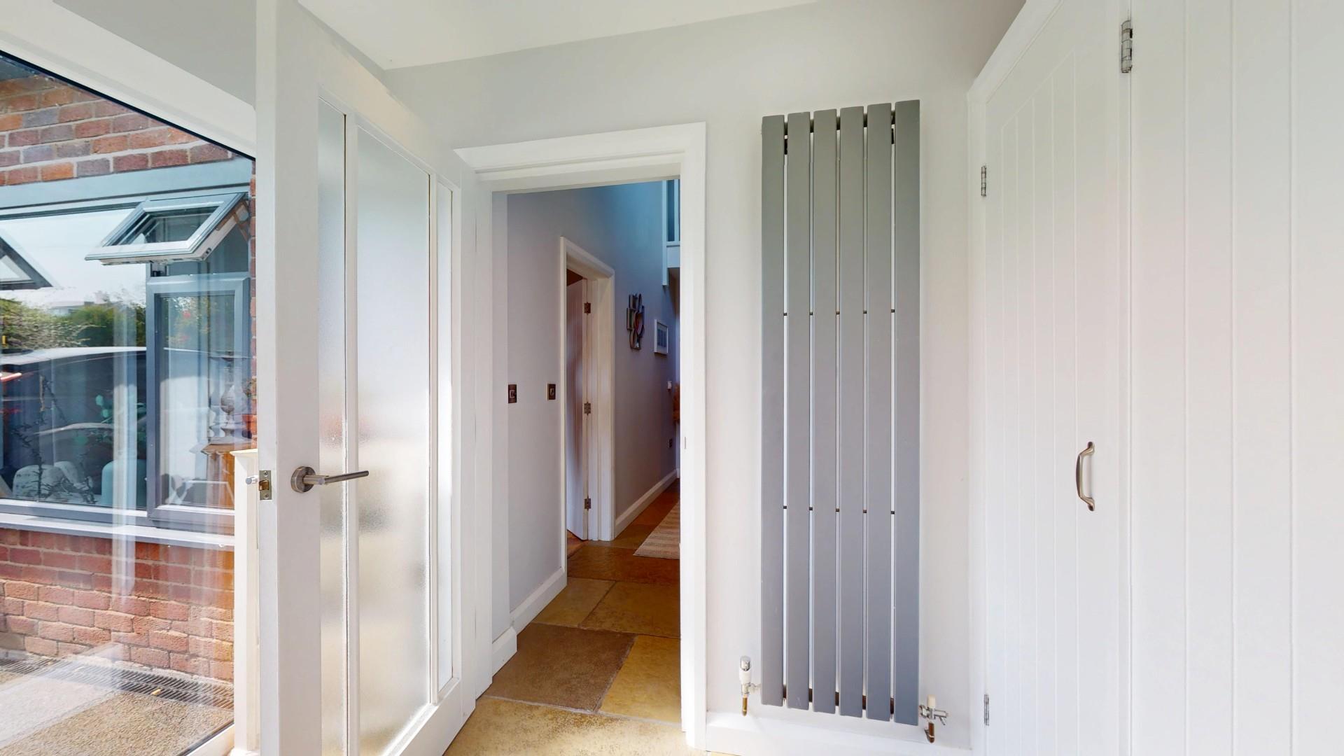 Three full depth double glazed windows, built-in storage cupboards with hanging rails and shelf, limestone tiled flooring which extends into the adjoining reception hall, contemporary vertical column radiator. Glazed door leading to L-shaped hall.