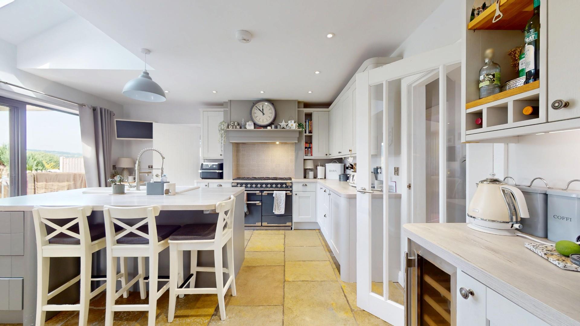 There is an inglenook style recess with space for large six burner range cooker with ovens, concealed extractor hood above, integrated fridge, wine cooler. The roof is part vaulted with two Velux roof lights affording a high degree of natural light and a fine limestone effect tiled floor to match the reception hall.