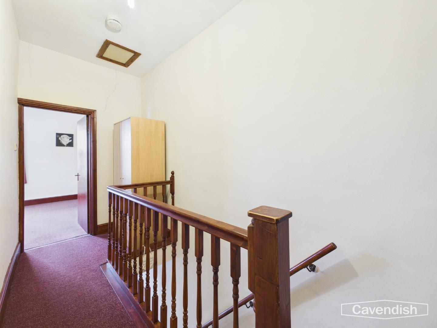 Spindled balustrade, ceiling light point, smoke alarm, and access to loft space. Doors to room four, room five and study/room.