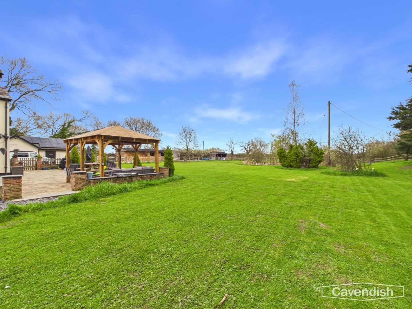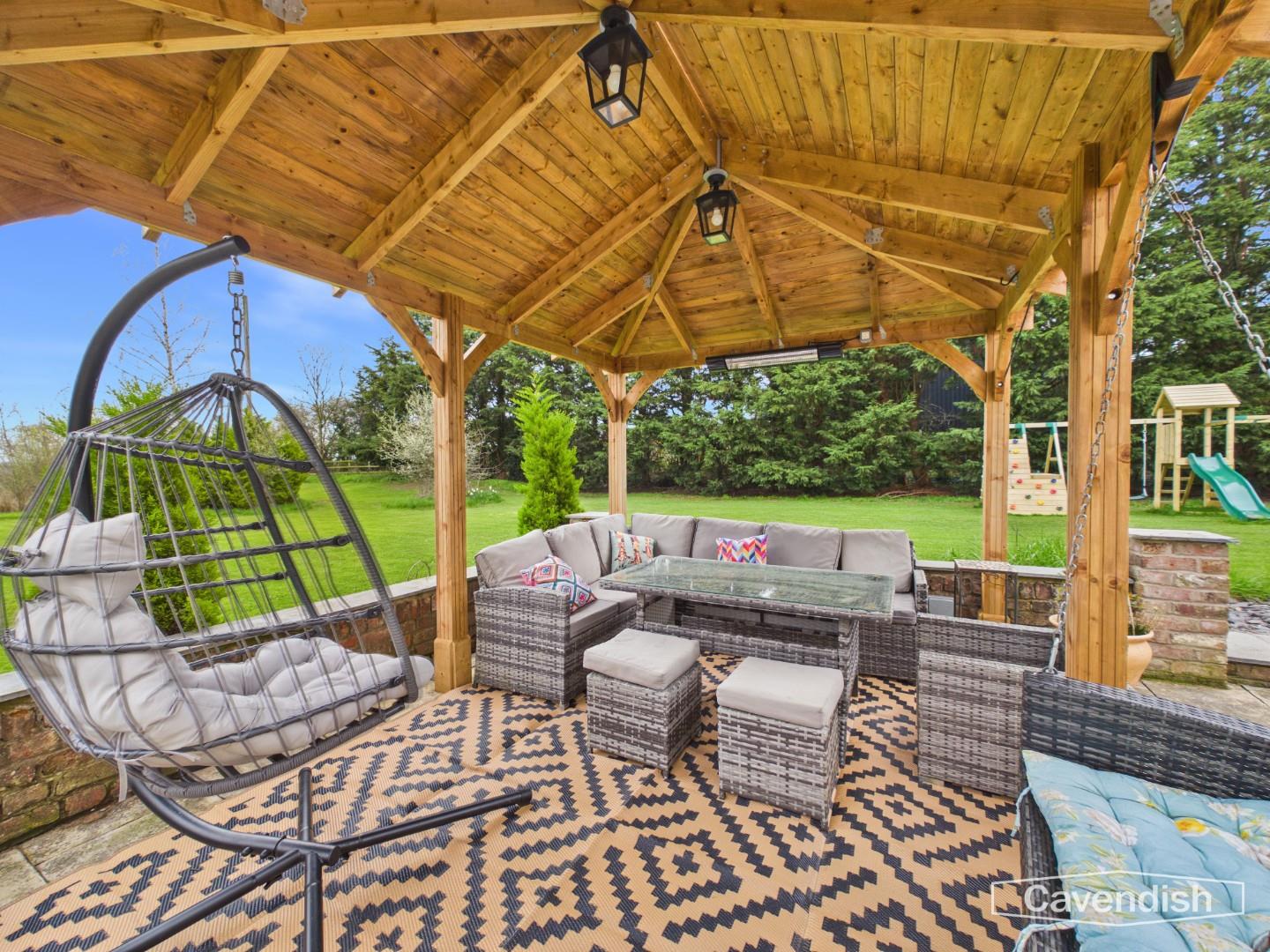 The property is set within extensive lawned gardens with a small pond and summer house, paved terrace enjoying French doors from the sitting room and kitchen with a covered outdoor seating area and heater.