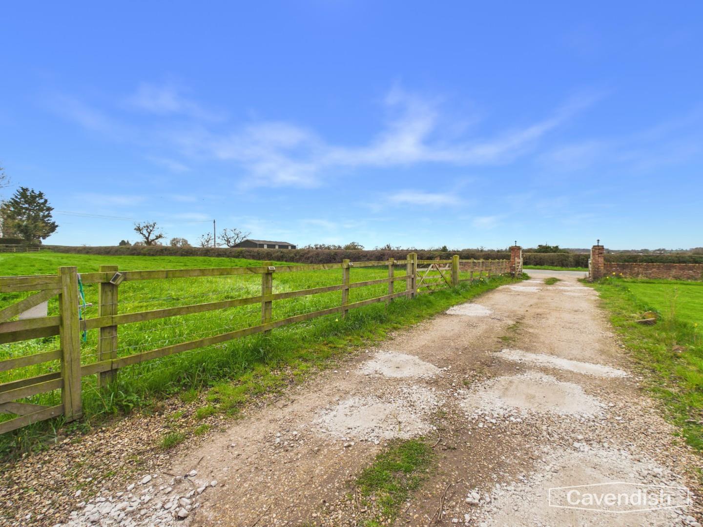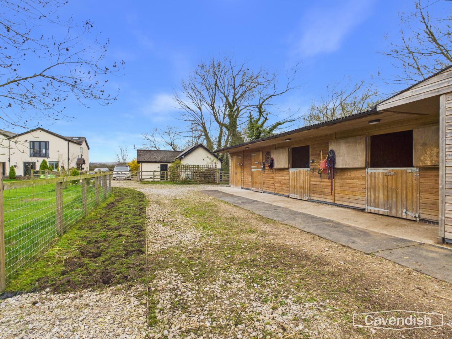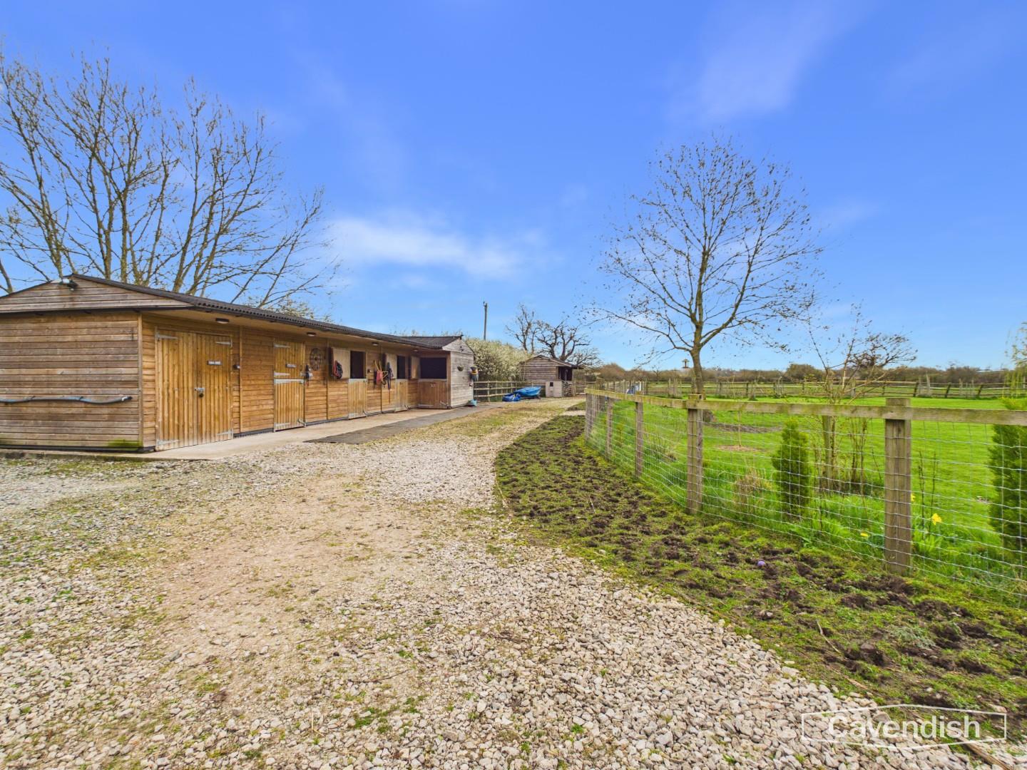 The property is set well back from the road and is approached via a long gated driveway which leads to an extensive parking area with exterior lighting and water tap. A further gate leads to a range of stables and covered store, with a two paddocks beyond. To the front there is a small paddock enclosed by hedging and post and rail fencing with a 5-bar wooden gate. Outside water tap, exterior lighting.