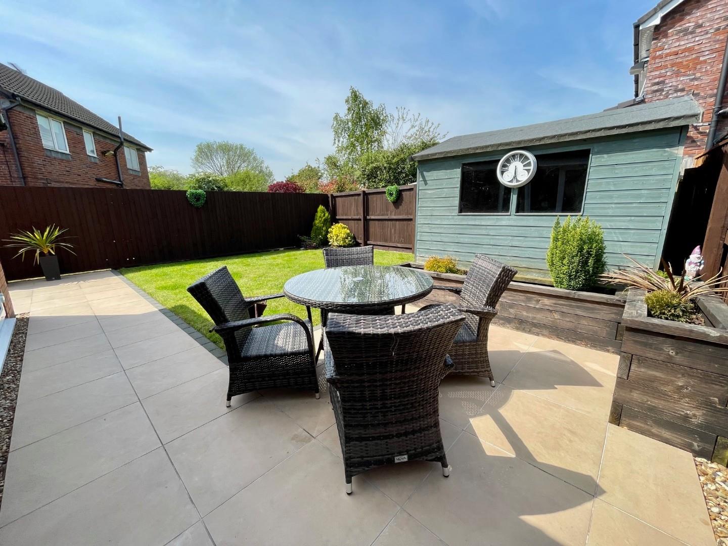 To the rear the garden has been attractively landscaped and designed for ease of maintenance with porcelain tiled terrace area, neatly laid lawn, raised bed and shrub border being enclosed by wooden fencing. Outside lighting, outside water tap, and timber built garden shed.
