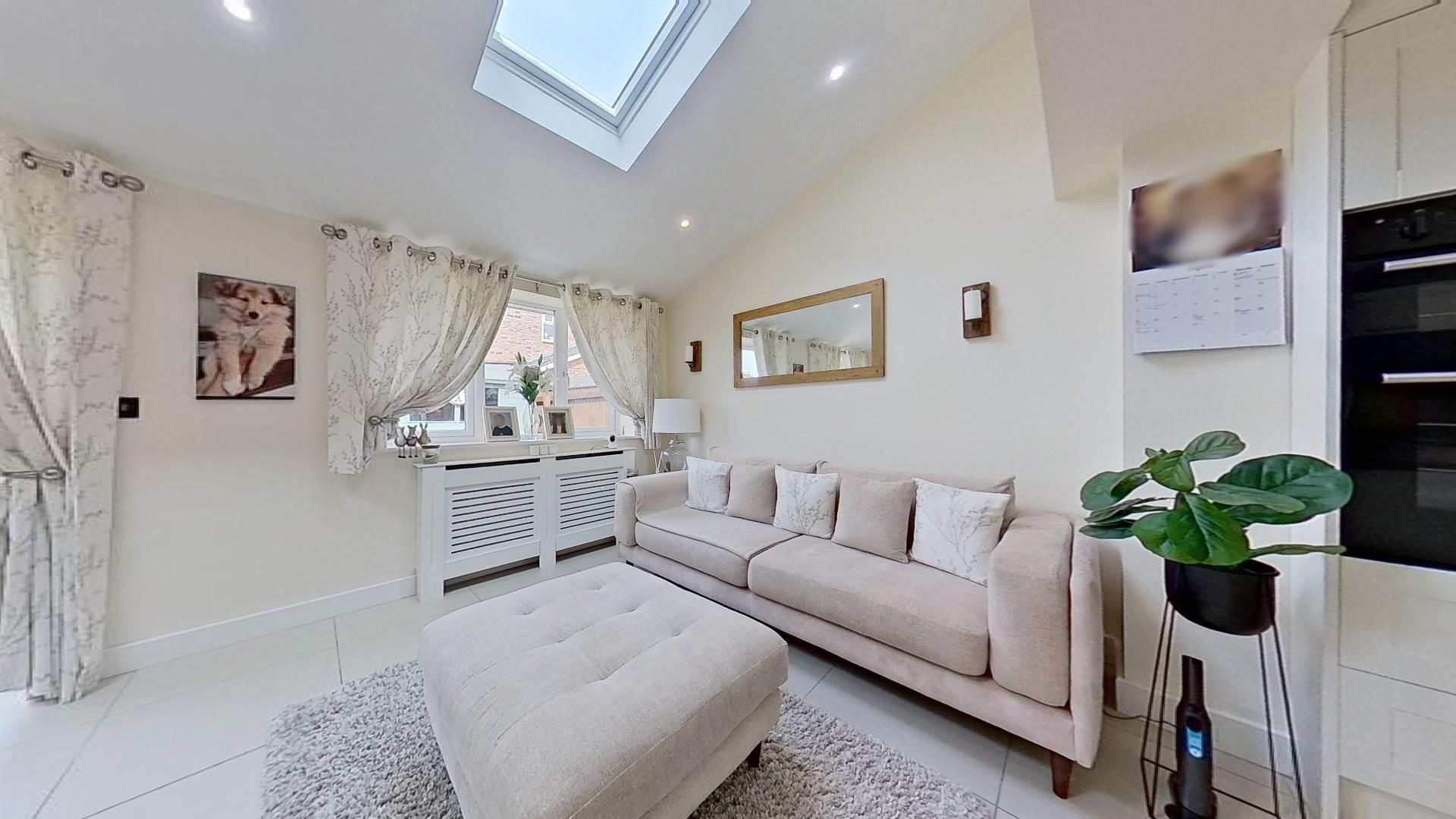 Feature vaulted ceiling with two double glazed roof lights, recessed LED ceiling spotlights, radiator with radiator cover, provision for wall mounted flat screen television, porcelain tiled floor, UPVC double glazed window overlooking the rear garden, and UPVC double glazed French doors to outside.