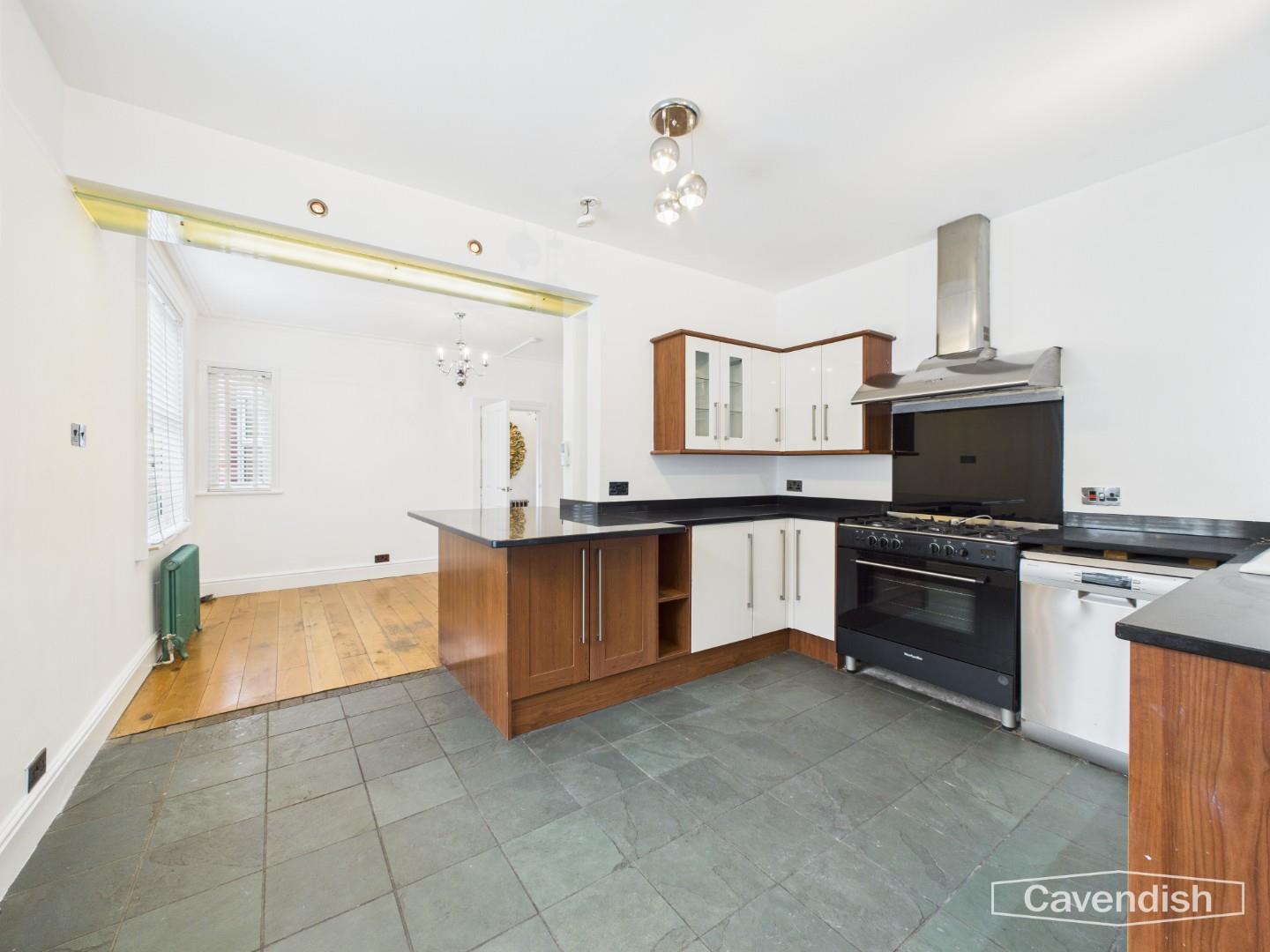 Fitted with a modern range of base and wall level units incorporating drawers and cupboards with quartz worktops and matching upstands incorporating a small breakfast bar. Free-standing Montpellier range style cooker with five-ring gas hob, gas oven and pan store with splashback and extractor above. Plumbing and space for dishwasher, ceiling light point, spotlighting, column style radiator, slate tiled floor, UPVC double glaze window overlooking Ermine Road, and small UPVC double glazed window overlooking the courtyard, Part-glazed door to sitting room.