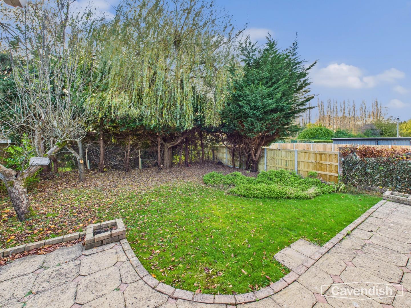 The garden offers a pleasant outdoor space with a well-maintained lawn bordered by mature trees and shrubs, providing a good degree of privacy. A paved patio area curves around one side, ideal for outdoor seating or dining. The garden is enclosed by wooden fencing, and the mixture of greenery and paved surfaces creates a balanced and inviting environment for relaxing or entertaining.