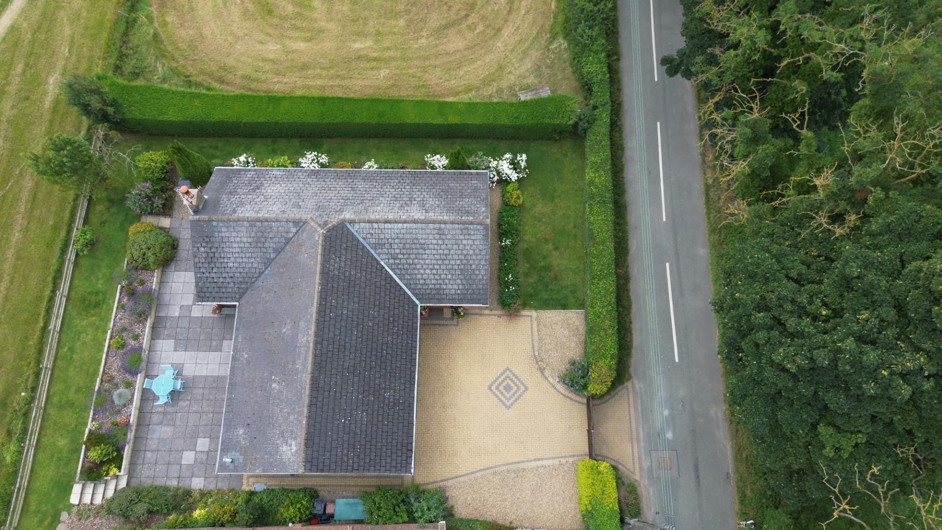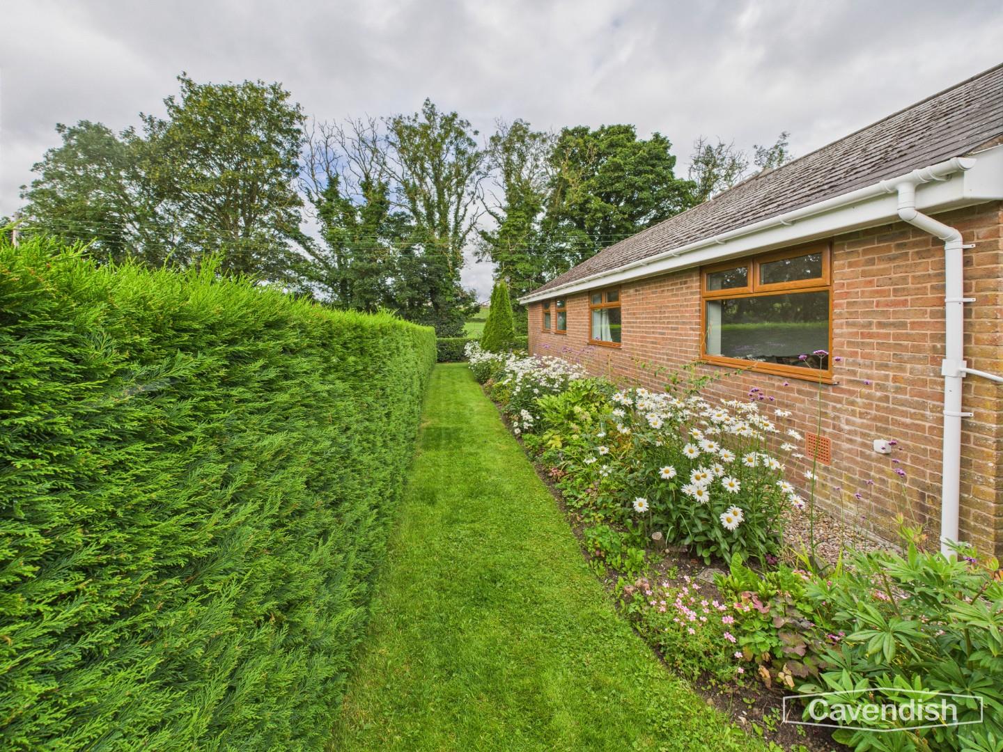 Set behind gates, the property is approached via a paved driveway offering parking for three vehicles and access to an integral single garage. The wrap-around garden features a well-maintained lawn, gravel pathways, mature planted borders, and hedgerow, offering privacy and a peaceful setting.