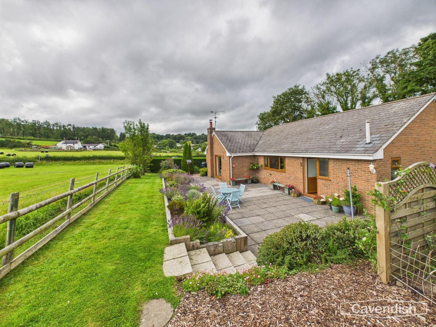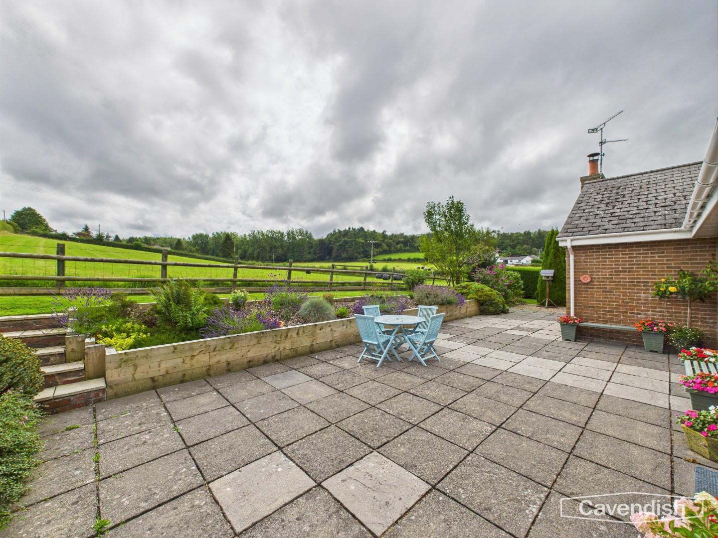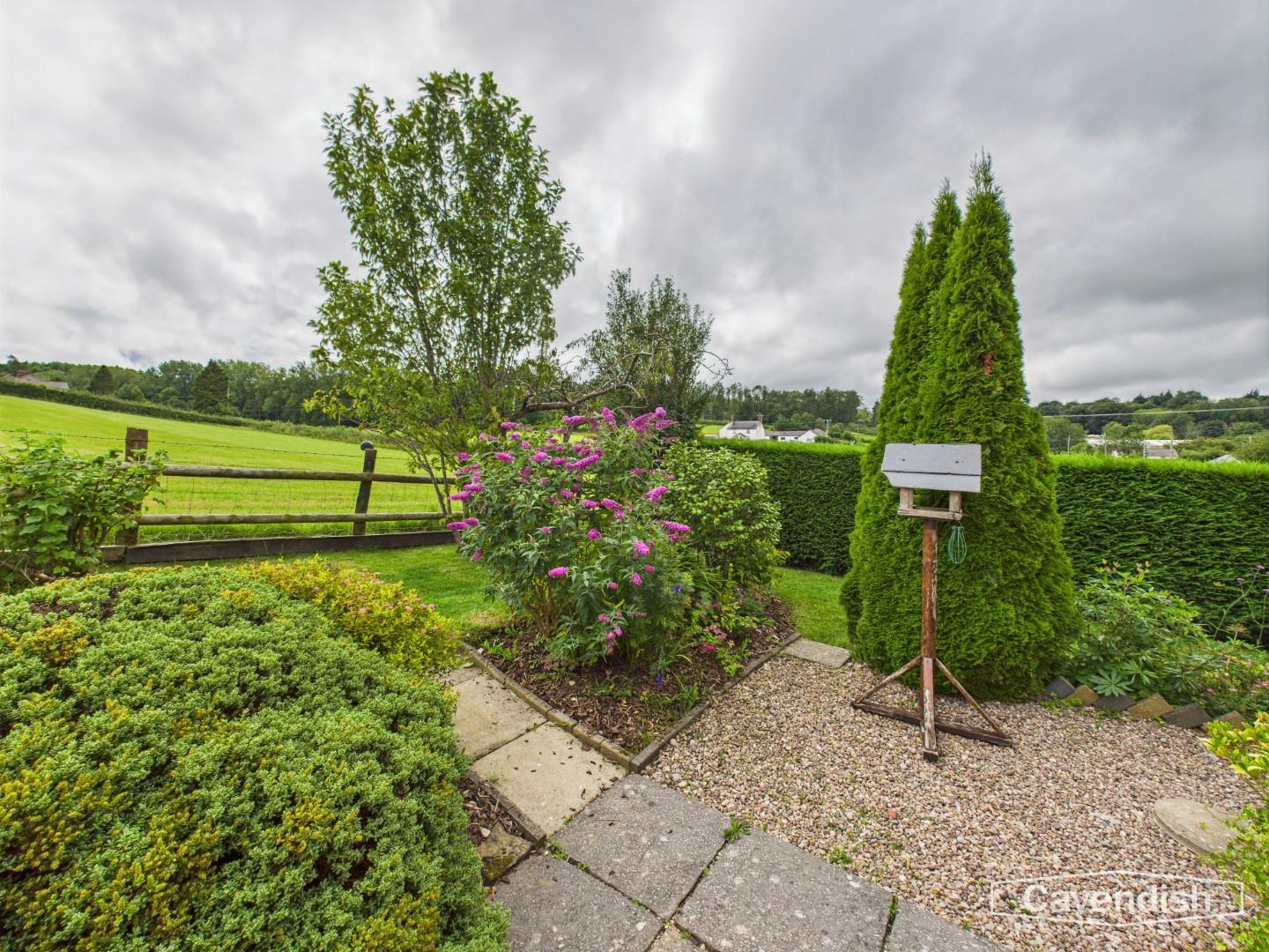 The rear garden is landscaped with a large patio area, raised beds edged with railway sleepers, mature shrubs, steps to an additional seating area, garden shed, oil tank, and water butt. To the side is a log store and access back to the front garden. An outside tap and lighting add convenience, and the setting enjoys open views across rolling countryside—perfect for enjoying peaceful outdoor living while being within close reach of Mold.