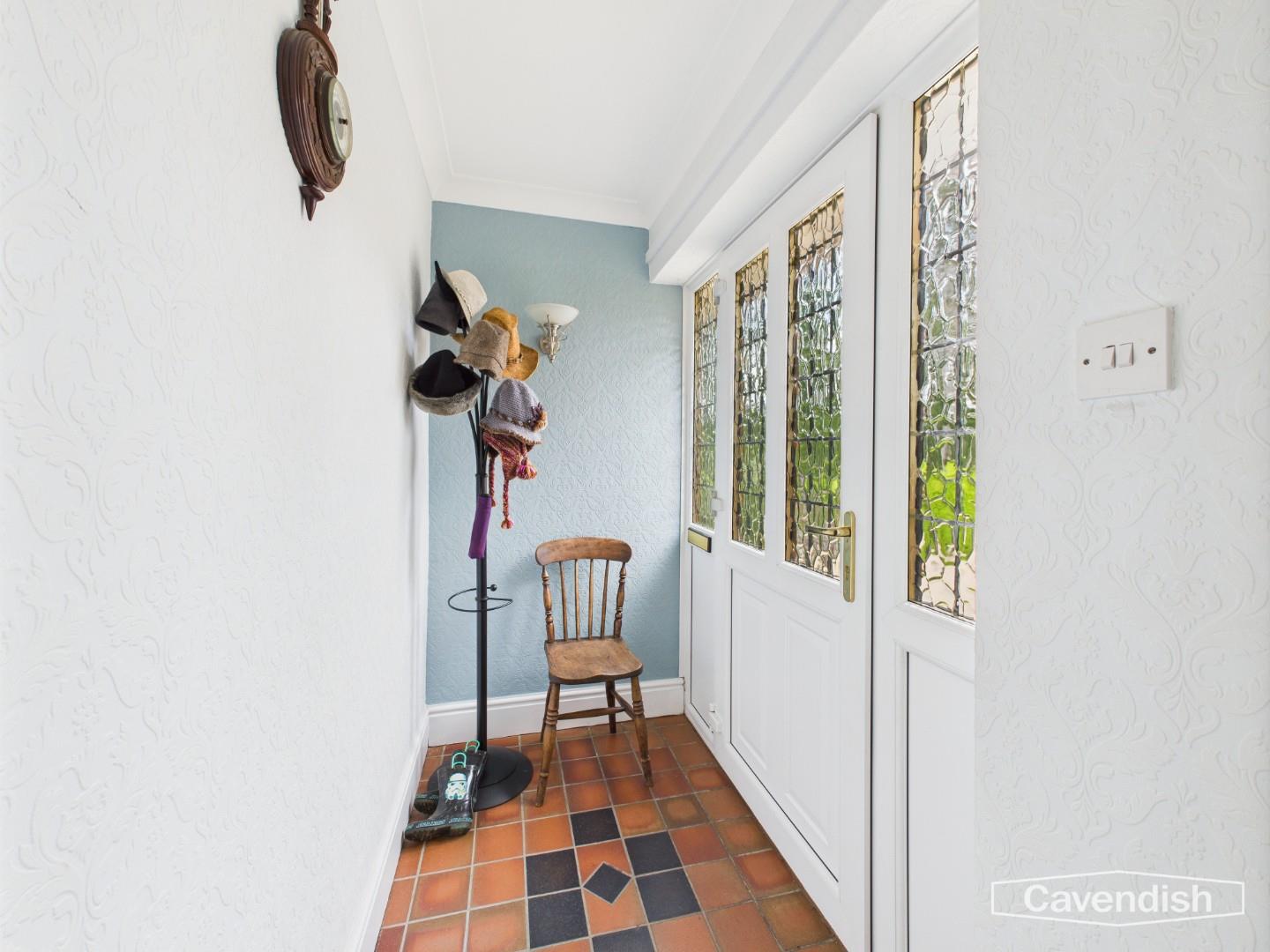 The entrance is through a wood-effect UPVC door into a porch with terracotta tiled flooring.