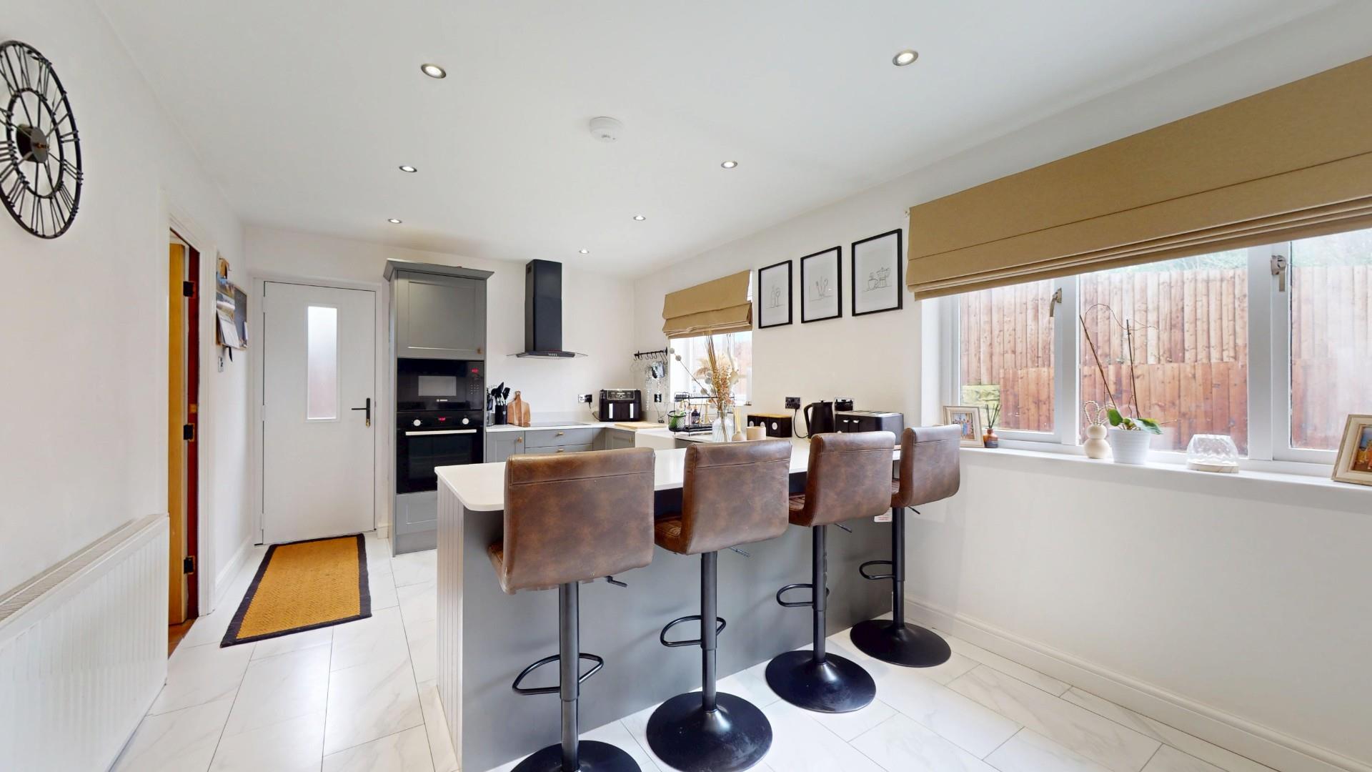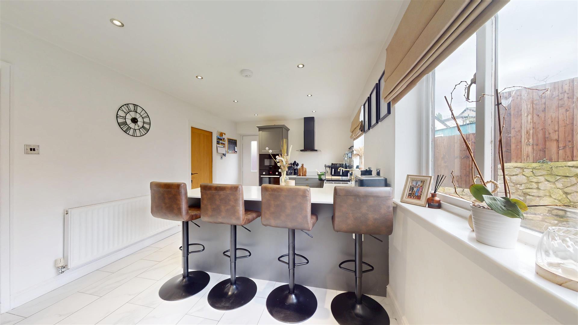 Recently refurbished with a contemporary range of base and wall mounted cupboards and drawers with a large peninsular divide and breakfast bar, it has a grey painted finish to door and drawer fronts and contrasting composite marble effect working surfaces to include a white glazed Belfast sink with mixer tap, inset four ring electric hob with extractor hood and light above, integrated Bosch oven with separate microwave, integrated dishwasher, fridge and corner carousel, marble effect flooring, painted wall panelling in part with TV point, wall light points, downlighters and glazed door to side.