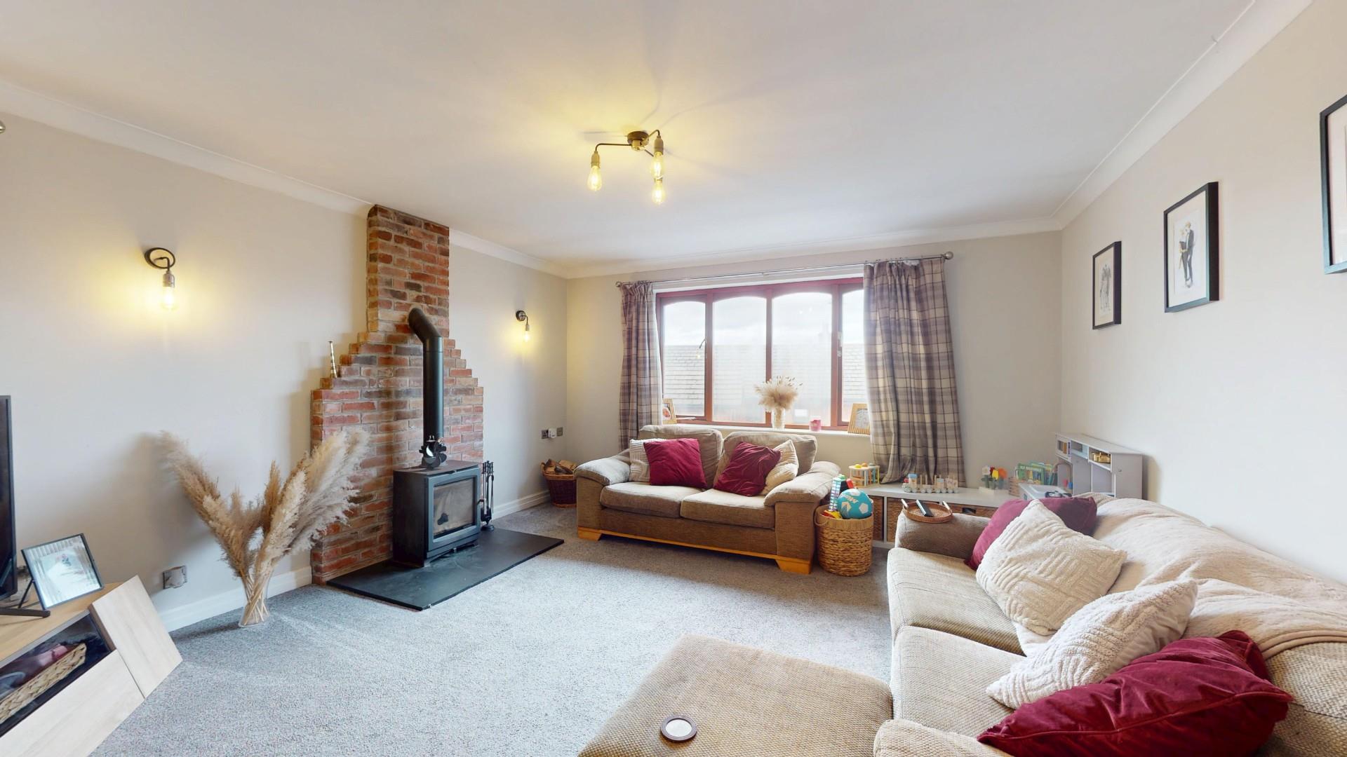 A spacious room with a wide window to front, feature brick chimney breast with wood stove on a slate hearth, coved ceiling, t.v. point and radiator.
