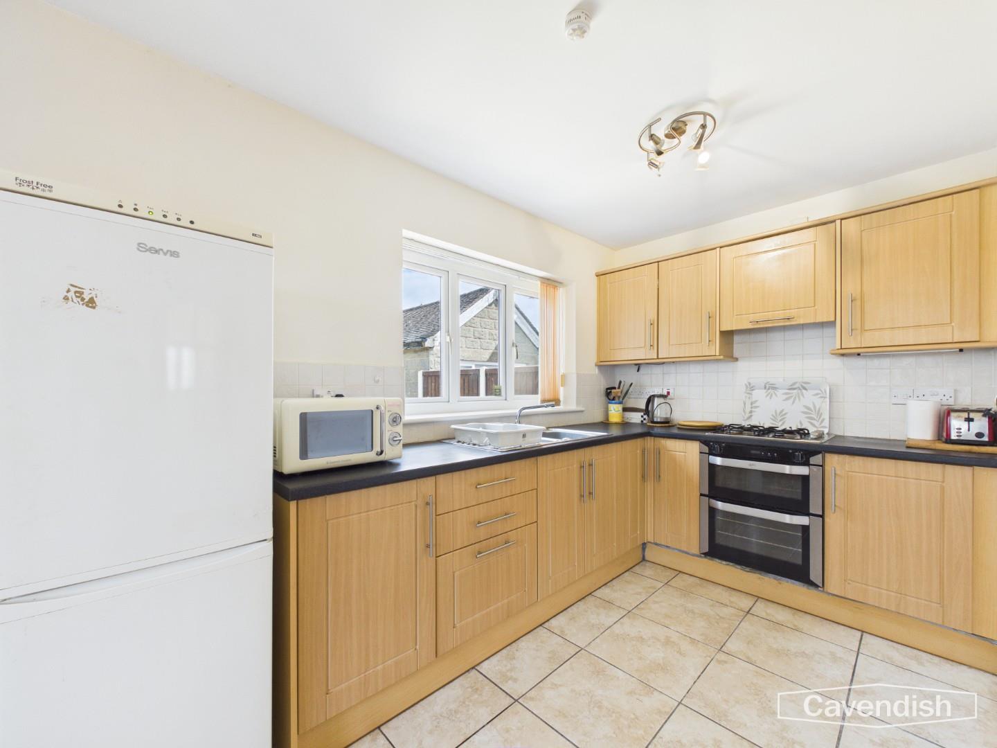 The kitchen is fitted with a range of beech-effect wall and base units, complemented by black worktops and tiled splashbacks. There is space for a gas cooker with extractor hood, along with a stainless steel sink and ample storage. Dual-aspect windows provide excellent natural light, while the dining area creates a sociable space for family meals.