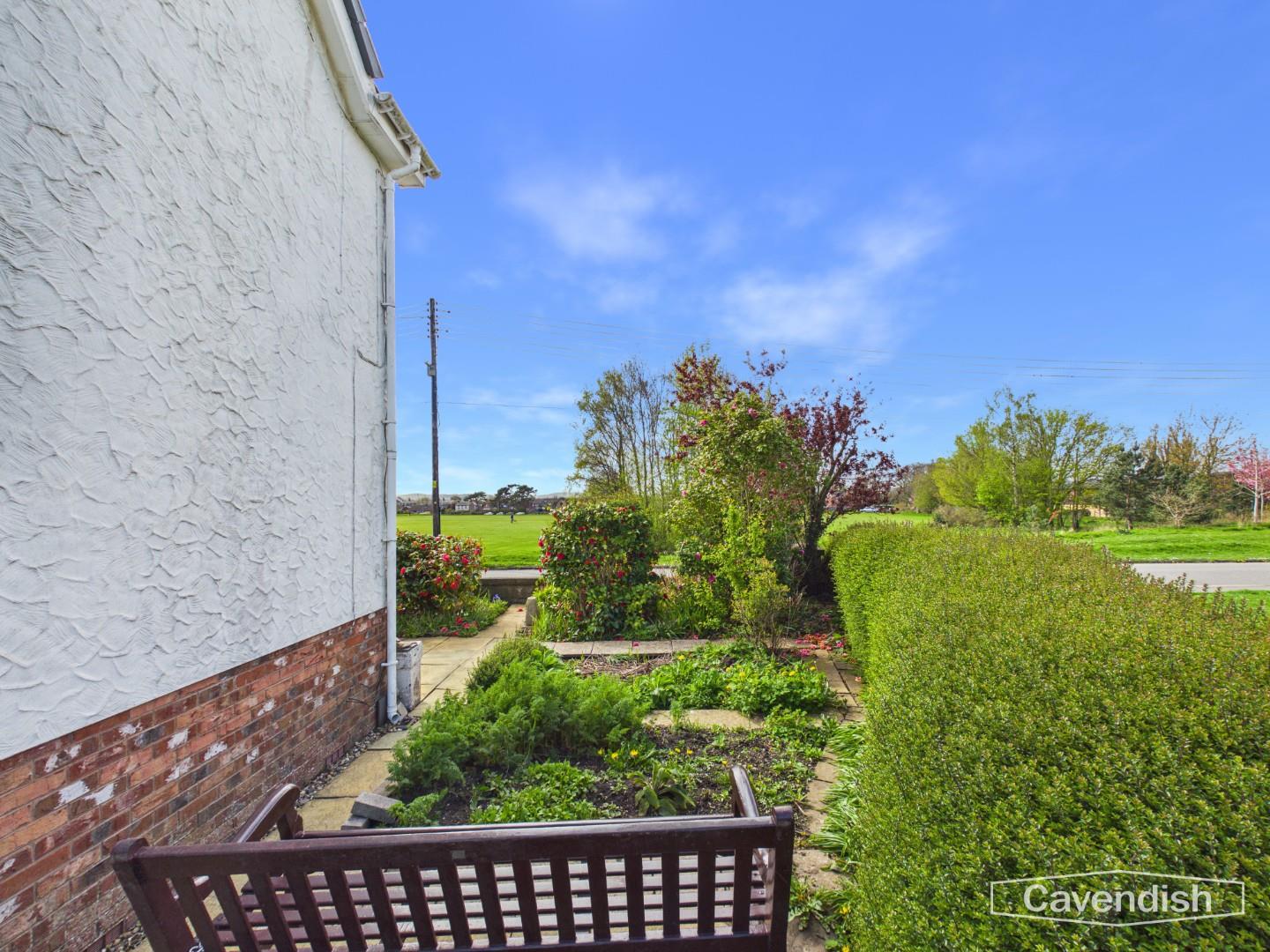 The property enjoys a generous plot with wraparound outdoor space. To the front, a landscaped garden with mature shrubs and rose beds enhances the kerb appeal, while a side pathway leads to the rear yard and garden areas.