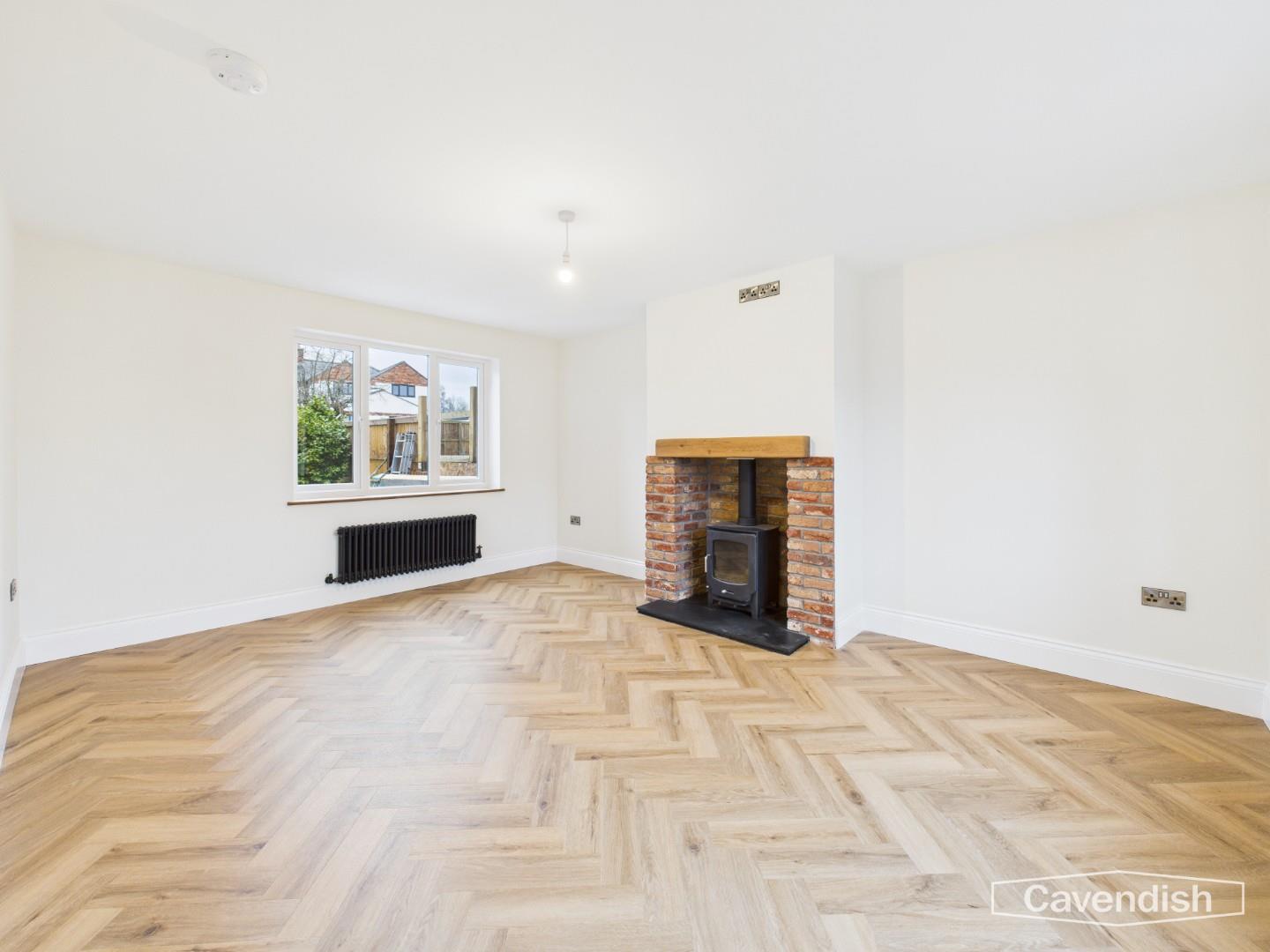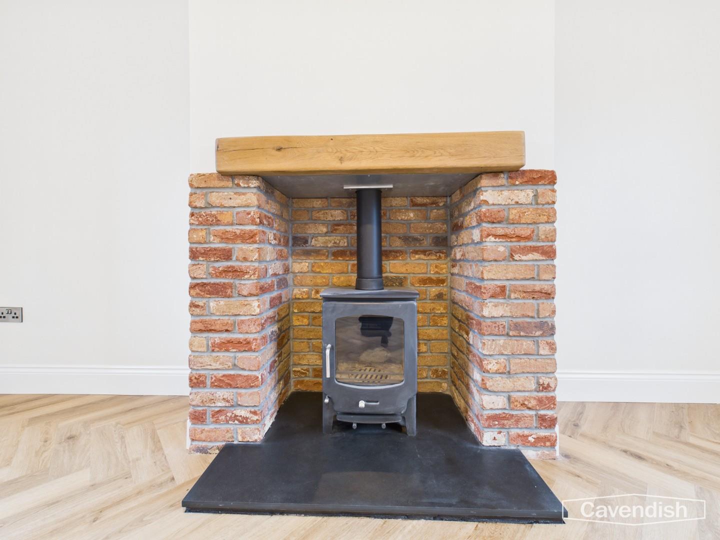 A light and inviting living room benefiting from windows to both the front and rear elevations. The herringbone flooring continues, complementing the stunning log burner which sits within a brick feature surround with oak hearth. A cast-iron style feature radiator adds to the character, making this a warm and attractive space for relaxing and entertaining.