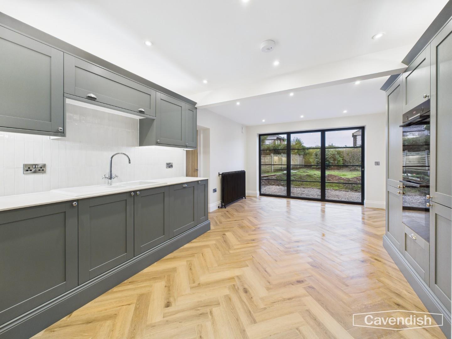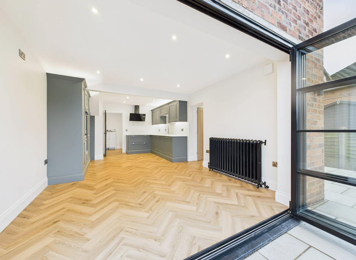 A fantastic social space, perfect for family life and entertaining guests. Accessed via stylish black-framed glass doors that complement the impressive bi-fold doors to the rear, this brand-new kitchen is finished to a high standard throughout, with all appliances newly installed. The kitchen features a comprehensive range of contemporary wall and base units, including pan drawers and floor-to-ceiling units housing an integrated fridge freezer and double oven. Additional integrated appliances include a dishwasher, while a porcelain sink with mixer tap sits beneath a tiled splashback. The integrated hob is complemented by a sleek extractor fan above. A hidden under-stairs storage cupboard adds practicality, while herringbone flooring and a cast-iron style feature radiator complete the space. Bi-fold doors open directly onto the rear garden, and a further door provides access to the utility room.