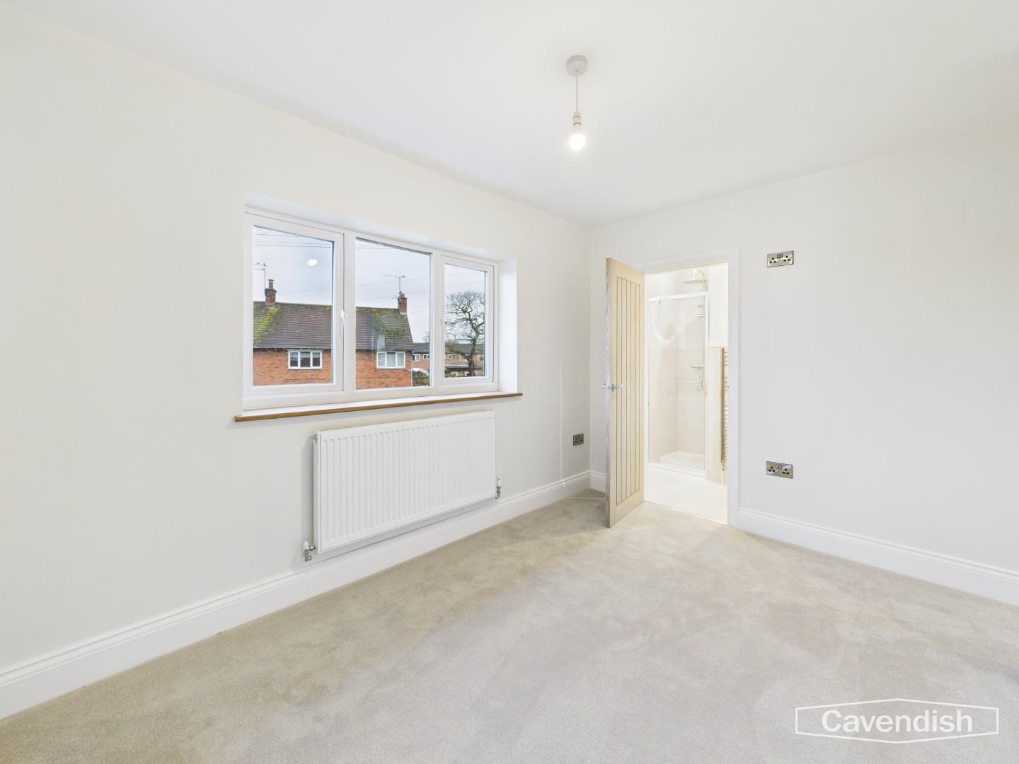 A well-presented principal bedroom with a window to the front elevation, allowing plenty of natural light. The room is finished with fresh carpets, a radiator, and a door leading to the en-suite shower room.