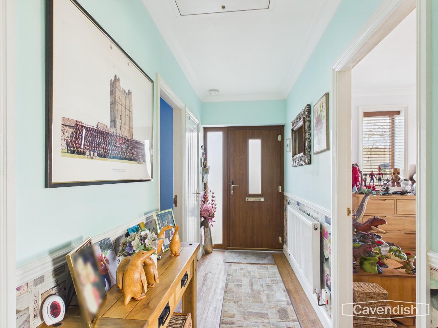 A composite wood-effect front door opens into a welcoming entrance hallway featuring wood flooring, decorative coving, a vintage-style white radiator and pendant lighting. The layout flows effortlessly, with reception space to one side and the kitchen/dining area to the other, creating a natural division ideal for flexible living.