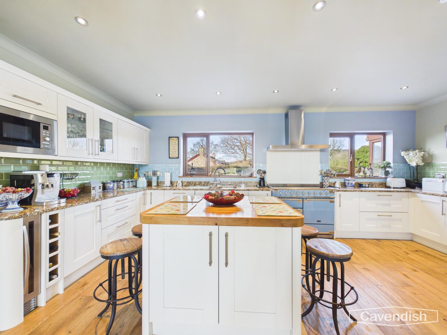 Undoubtedly the heart of the home, the kitchen and family room is an exceptional open-plan space, beautifully designed and finished to an outstanding standard. Thoughtfully laid out to combine cooking, dining and relaxing, this impressive room enjoys wonderful natural light from multiple double-glazed windows and a striking bay window that frames the surrounding gardens and countryside beyond. The kitchen itself is fitted with an extensive range of cream wall and base units, complemented by quartz worktops and a stunning mix of green and blue tiled splashbacks that add both colour and character. A superb Rangemaster cooker with five-ring hob takes centre stage, set beneath a stainless-steel extractor, while integrated appliances include a microwave, wine cooler, dishwasher and space for a large American-style fridge freezer, flanked by useful pantry cupboards. An island unit provides additional preparation space and creates a natural gathering point for family and guests alike.