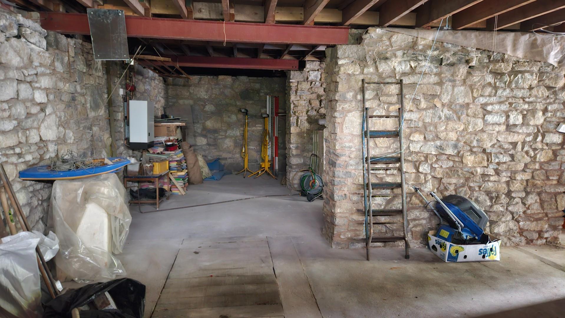 Metal up and over door leading into a garage area with inspection pit. It provides a very large area generally open with two stone faced supporting piers located centrally. Electric light and power, double glazed door opening to one side.