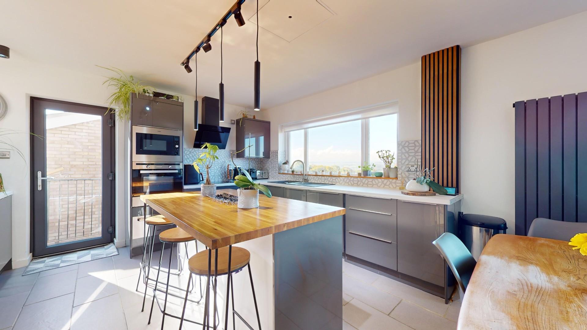 The kitchen has been refurbished with a contemporary range of base and wall mounted cupboards and drawers with a combination of anthracite and teal coloured finish to door and drawer fronts and contrasting white working surfaces. There is an inset one and half bowl sink with mixer tap and drainer, inset four ring electric hob with extractor hood above, integrated oven and microwave oven, space for upright fridge/freezer, integrated dishwasher, fitted cupboard, central island with drawers, cupboards and wide oak working surface providing a fitted breakfast bar. Modern anthracite coloured radiator, further window to front, glazed door leading to the external steps leading to the gardens and parking area.
