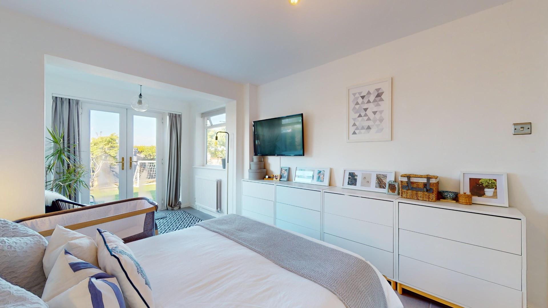A spacious and extended room with double glazed French doors opening to the garden, further windows to either side, light grey stone effect floor tiling, panelled radiator.