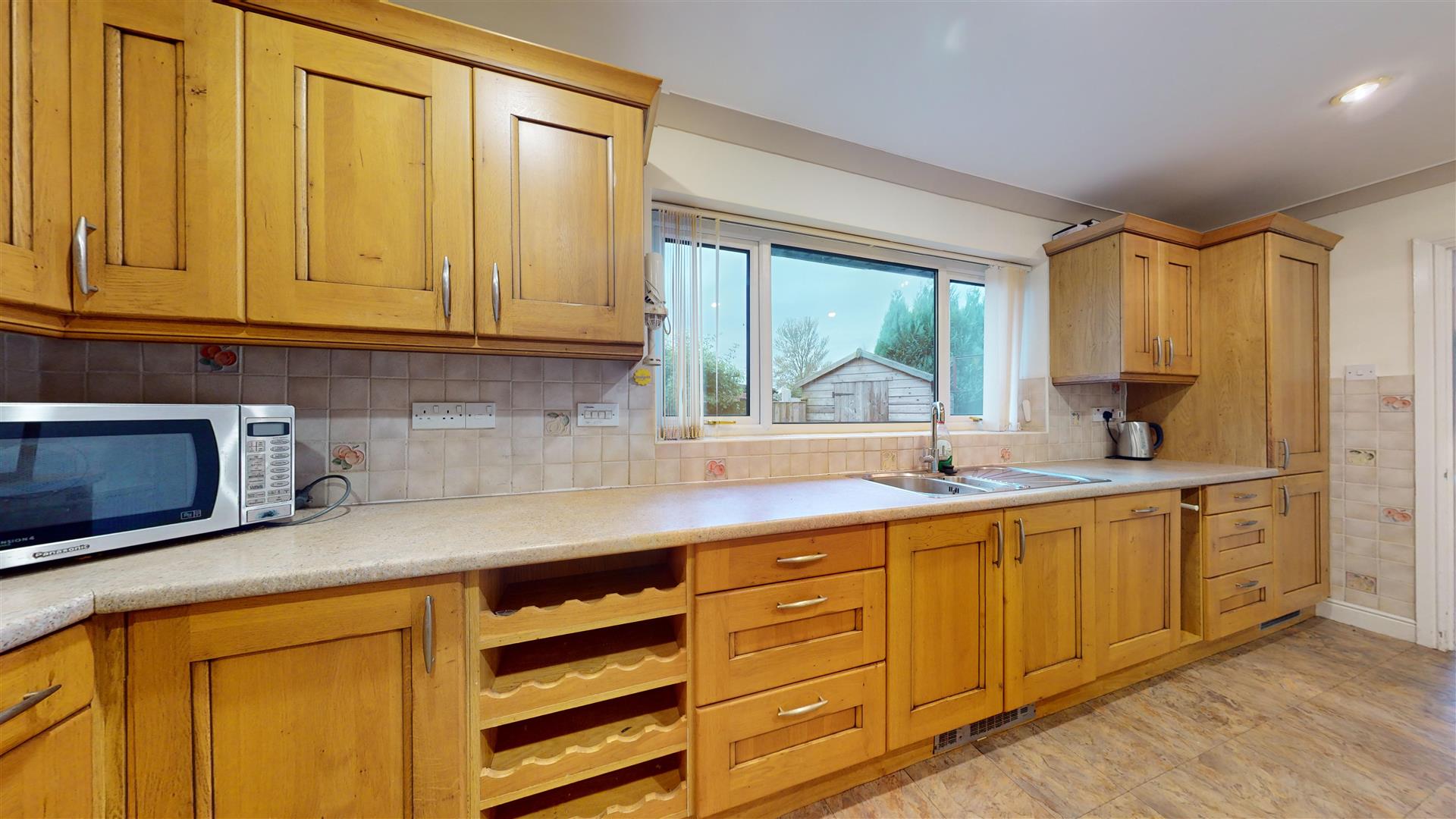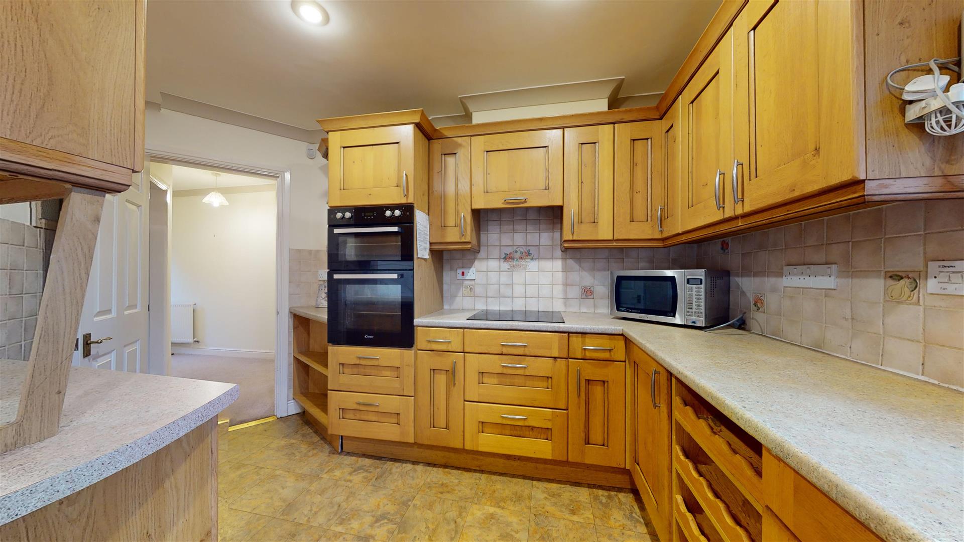 Fitted with an extensive range of oak fronted base and wall units with contrasting light toned work surfaces including a dividing peninsula unit. Tiled splashback, inset stainless steel sink unit with preparation bowl, waste disposal unit and mixer tap. Range of integrated appliances comprising touch control ceramic hob, cooker hood, electric double oven, dishwasher and fridge/freezer. Karndean tile effect flooring, radiator, recessed ceiling lighting, double glazed window overlooking the garden and radiator.