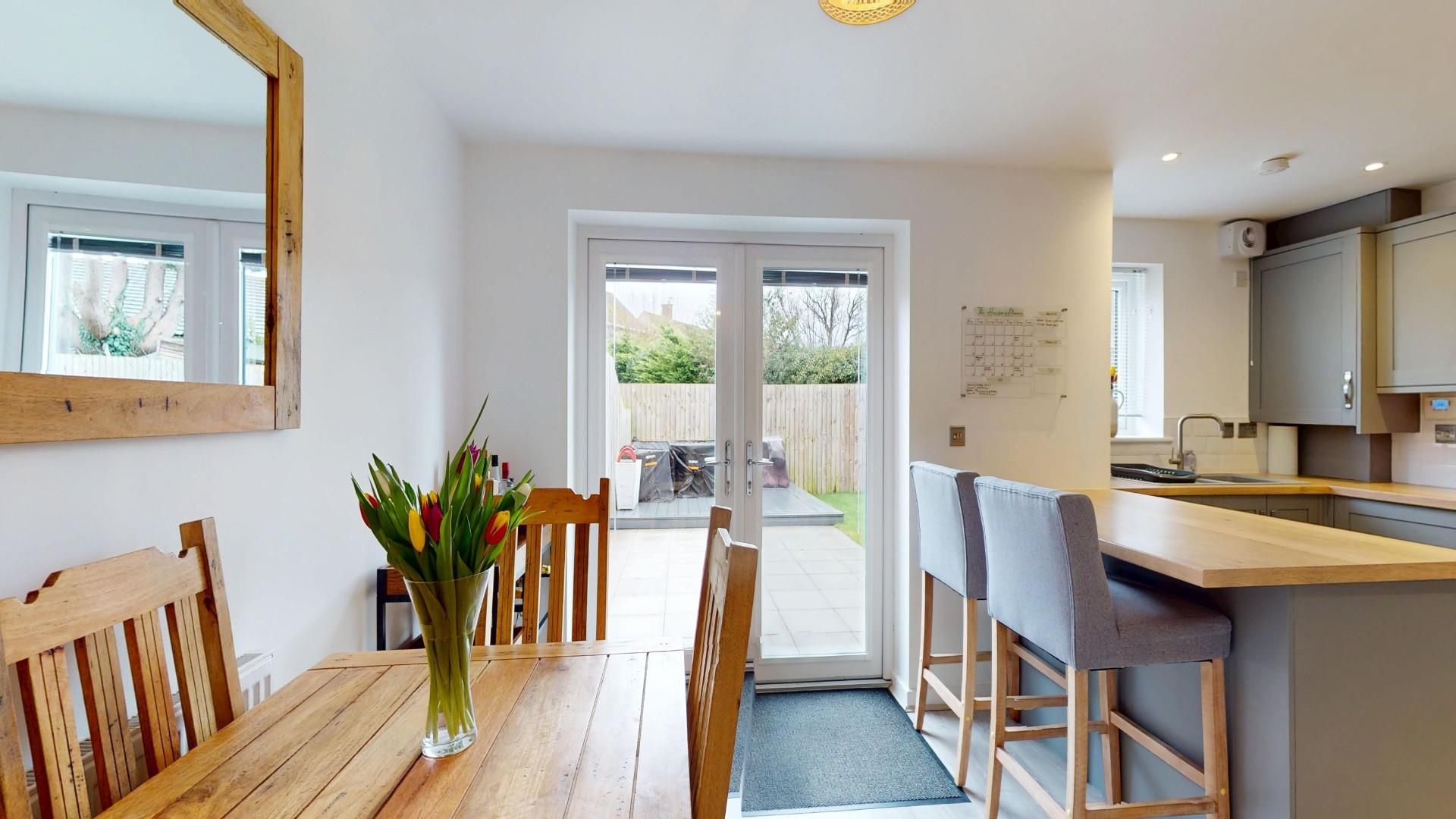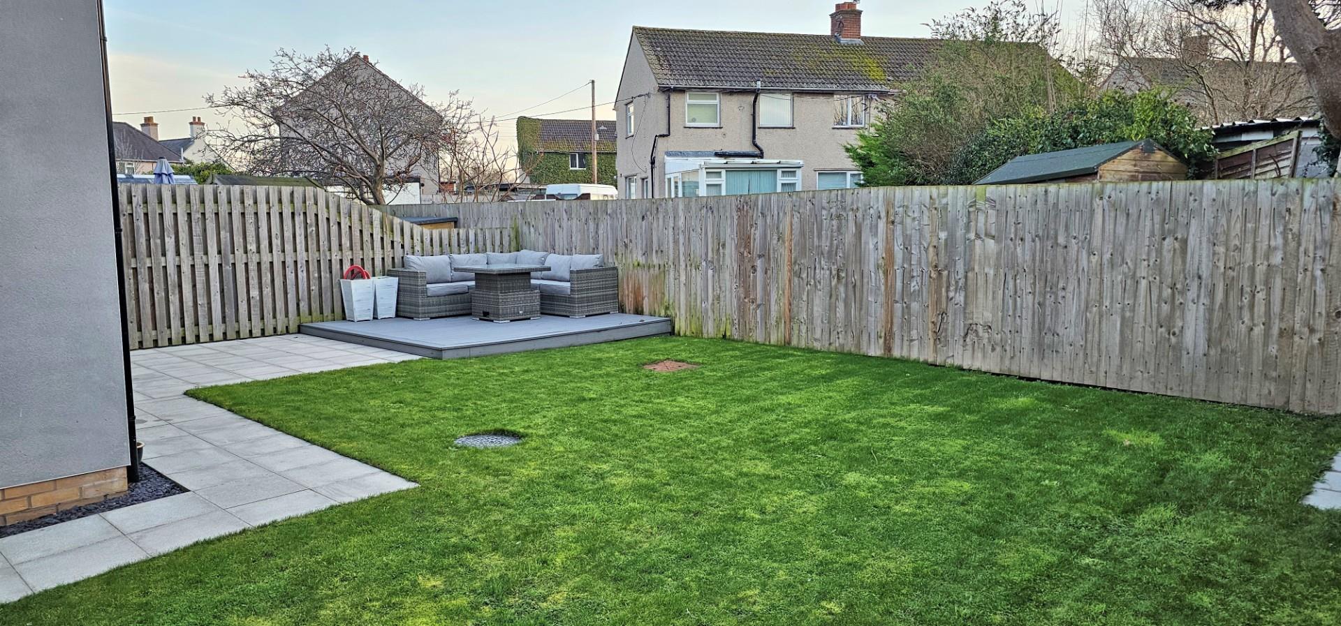The gardens extend around to the gable elevation with a large lawned area benefiting from screen fencing and extends around to the rear which is also mainly lawned together with a wide flagged patio and a raised composite woodgrain effect decked area.