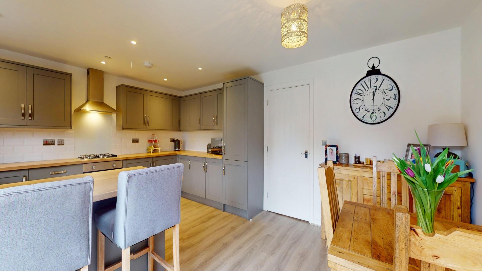 Large open plan kitchen/dining room designed to take full advantage of the pleasing aspect over the private mainly westerly facing rear garden, it is equipped with an extensive range of base and wall mounted cupboards and drawers with a light grey tone finish to door and drawer fronts and contrasting woodgrain effect working surfaces to include a peninsular divide.