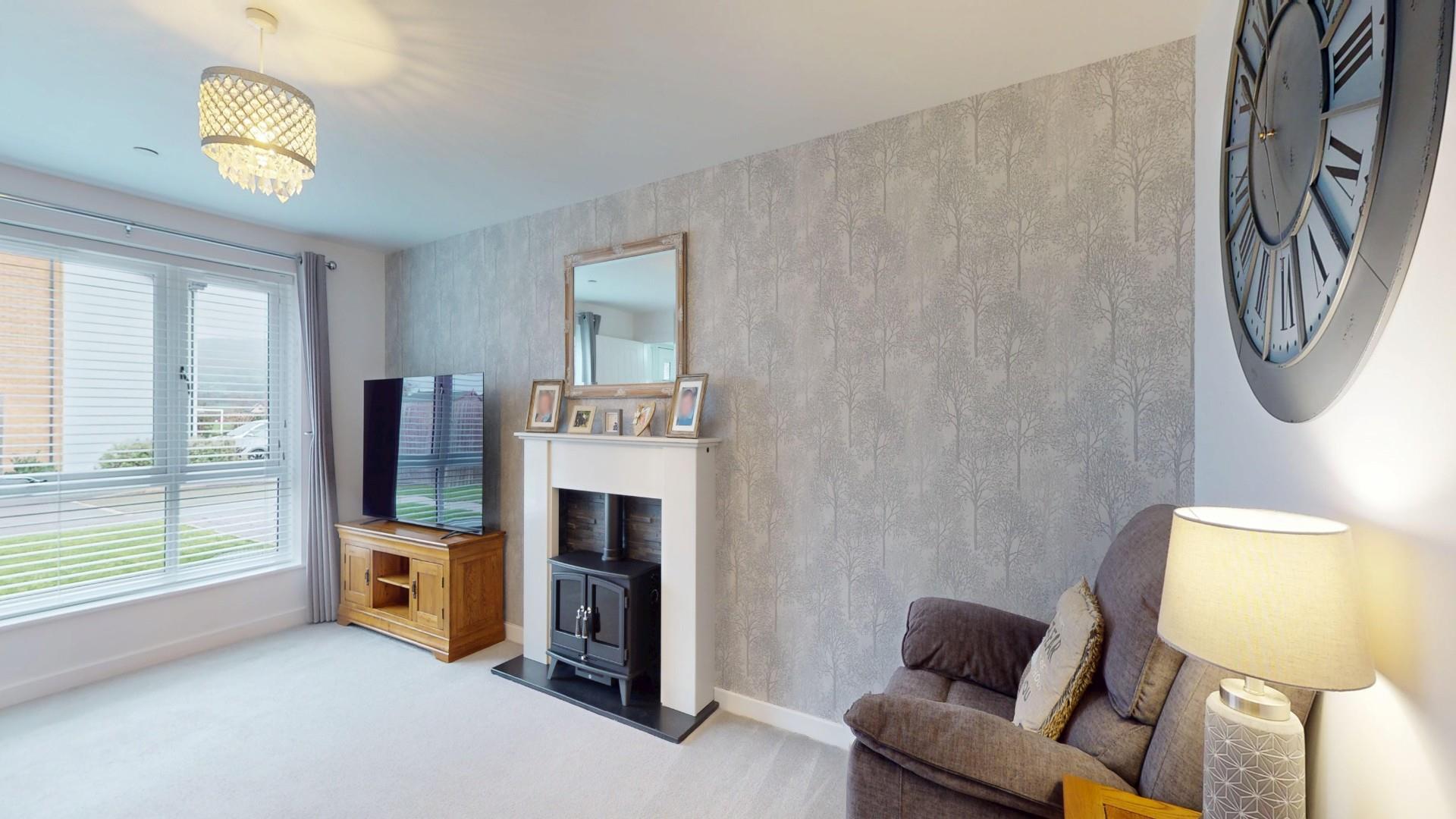 A spacious room, well lit with a wide double glazed window to front with views across the cul de sac towards the Clwydian Hills, Adams style fireplace with painted white surround, slate hearth, riven stone insert and coal effect electric stove. TV aerial point, panelled radiator.
