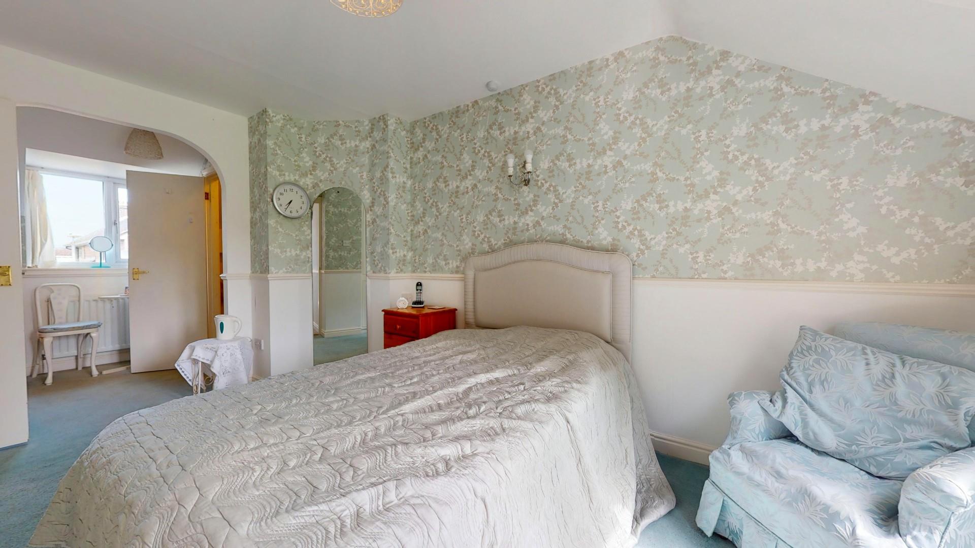 Double glazed French doors opening to a Juliet balcony with pleasing southerly views across Caeddol, fitted wardrobes to one wall, dado rail, panelled radiator.