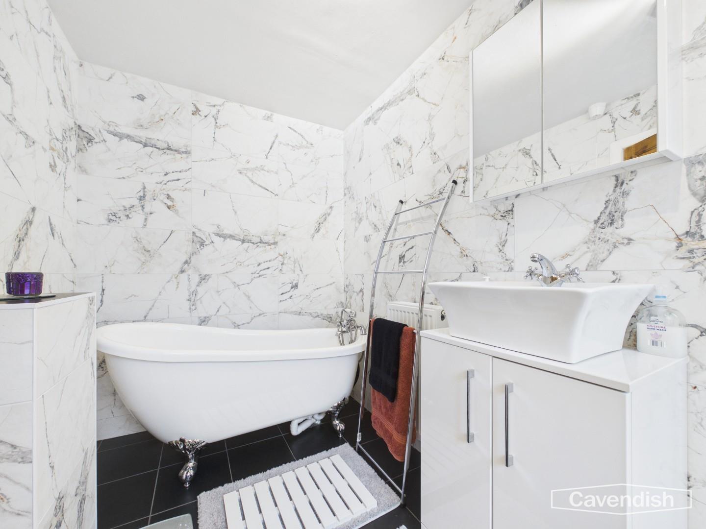 Positioned off the hallway, the bathroom has been finished to a high standard and offers a real sense of luxury. Black slate flooring complements the wet-room style walk-in shower with glass screen, while floor-to-ceiling white marble-effect tiling creates a clean, modern look. The room also benefits from a white WC, ceramic countertop basin with silver mixer tap and storage beneath, mirrored medicine cabinet, chrome radiator, spot lighting, ventilation system, and an obscured double-glazed window. A freestanding roll-top bath on feet completes this impressive space.