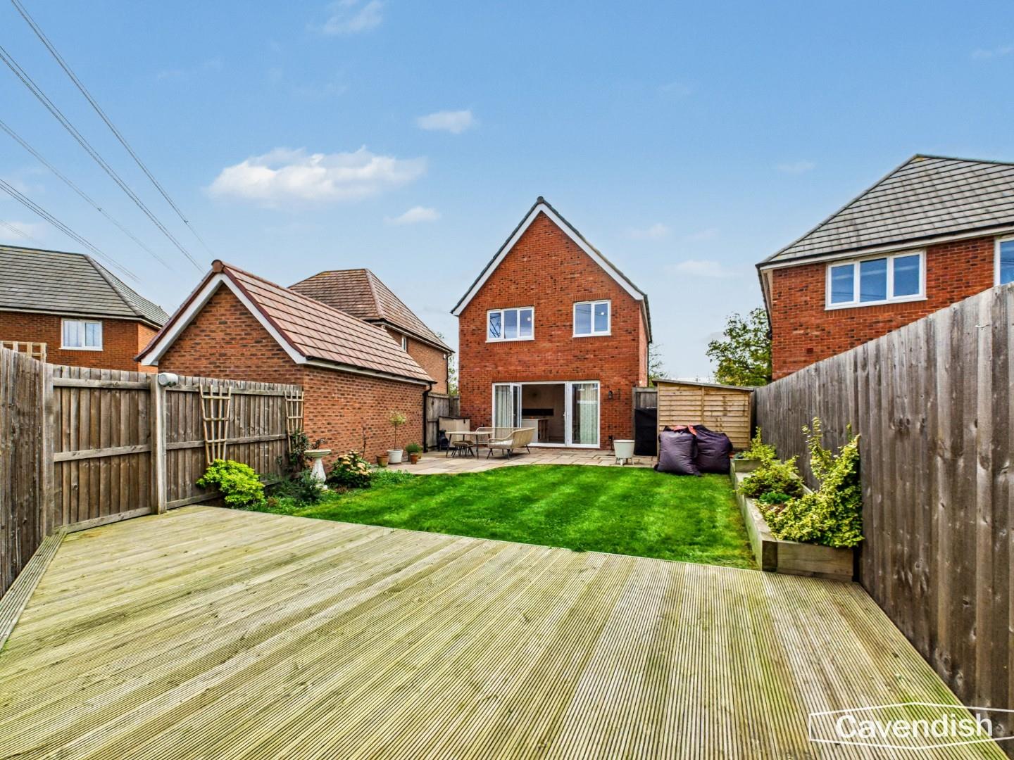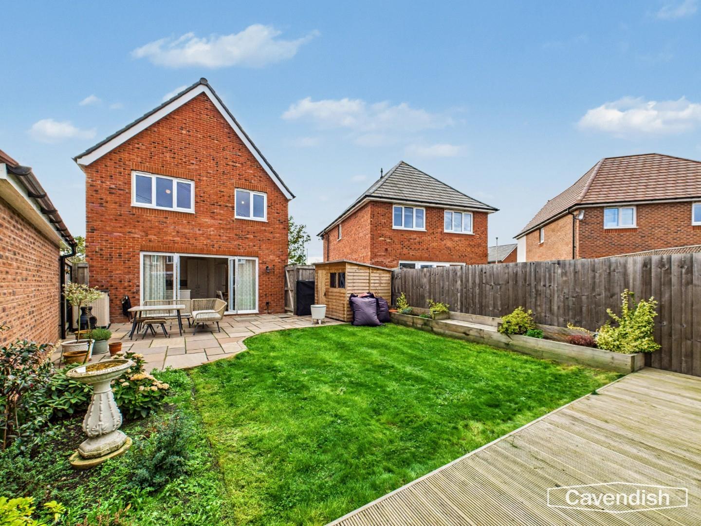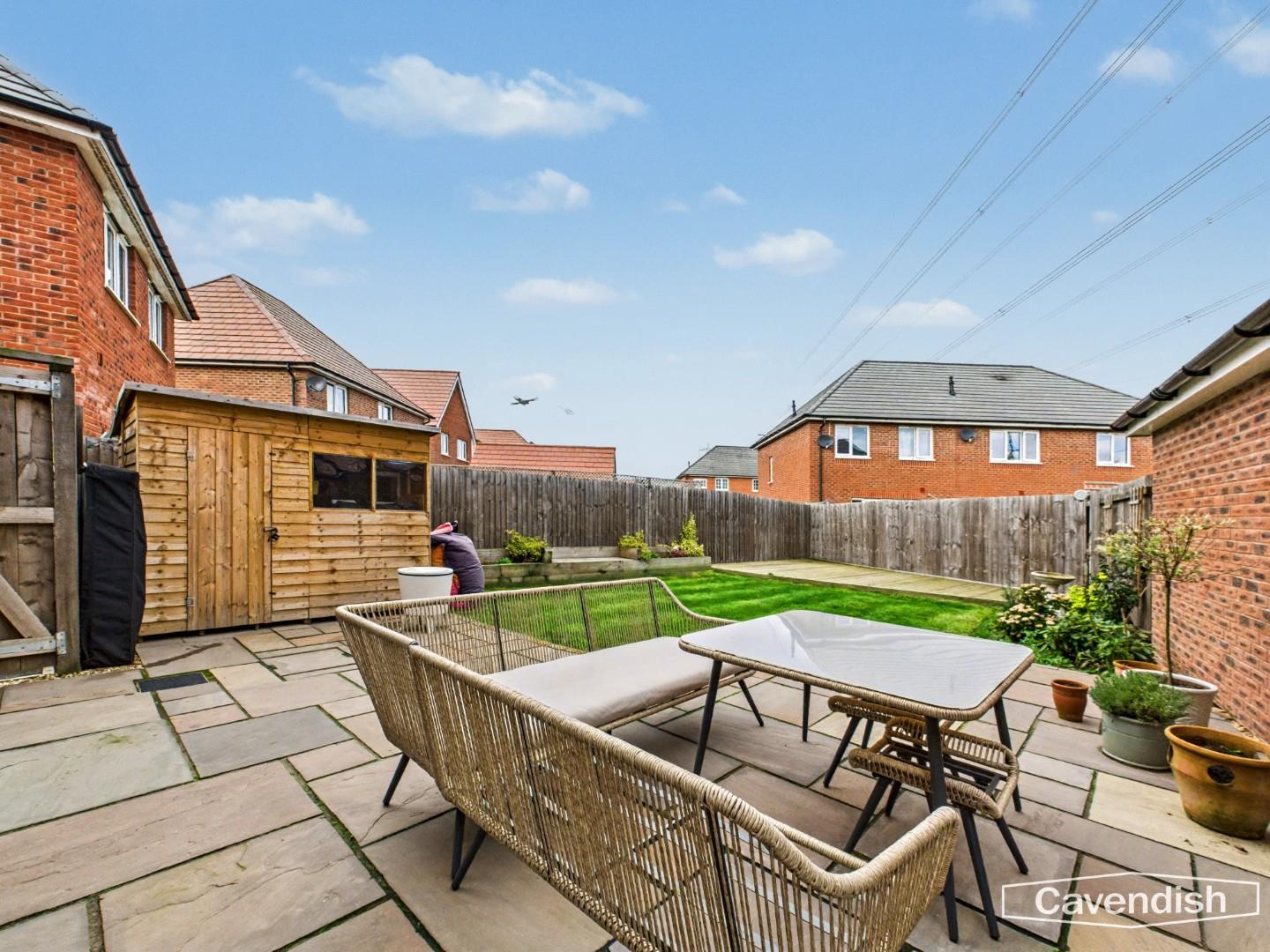 The rear garden offers a well-maintained lawn bordered by plants and shrubs, with a paved patio area that is perfect for outdoor seating and entertaining. A wooden shed provides useful storage space, and a decking area adds extra versatility to the outdoor living space.