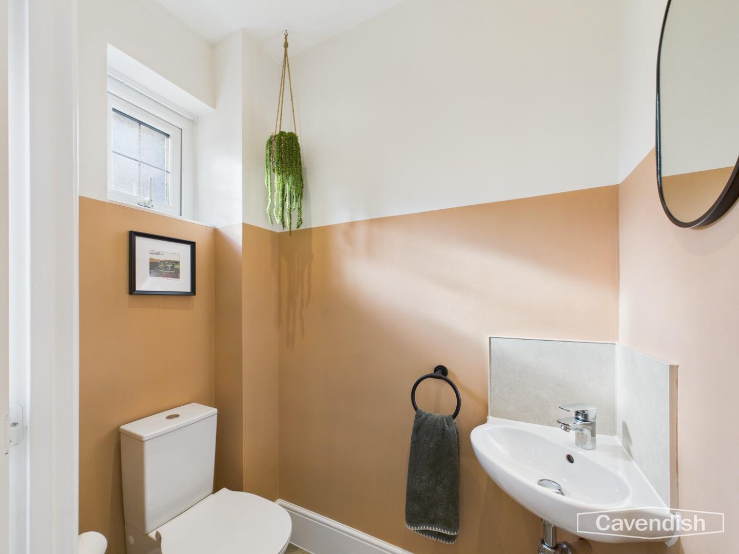 A conveniently located downstairs cloakroom with a WC and wash basin. The warm tone on the walls balances the white sanitary ware, creating a welcoming feel.