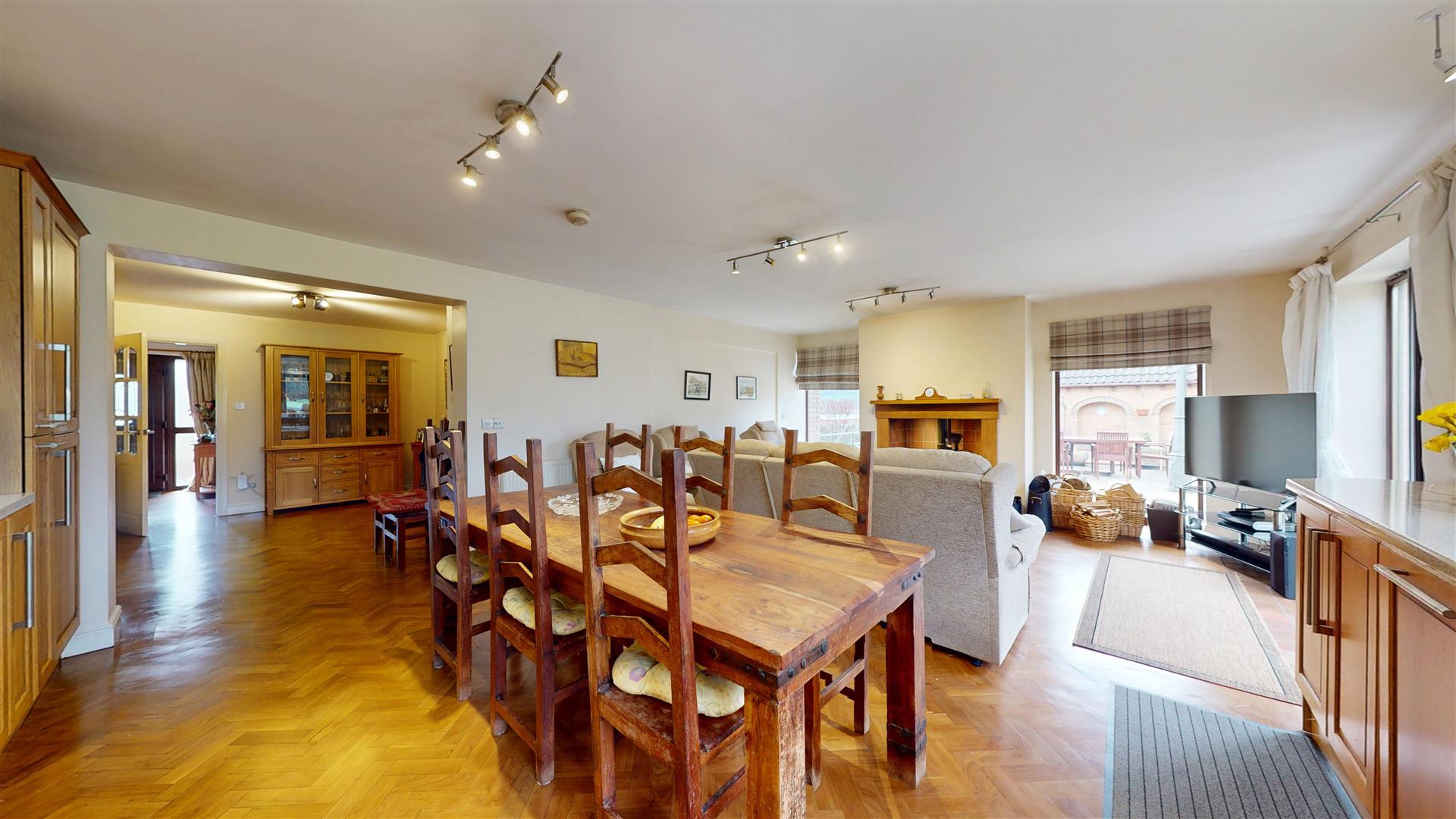A modern extension designed to take full advantage of the delightful views over the private garden and patio, it has two full depth double glazed windows to the western side together with double glazed French doors opening to the rear. The kitchen is fitted with an extensive range of base and wall mounted cupboards and drawers with solid oak panelled door and drawer fronts and contrasting stone effect working surfaces to include an inset 1.5 bowl sink with mixer tap and drainer, space for slot in cooker with gas and electric point and large extractor hood above, integrated dishwasher, fridge and freezer, pull out larder unit. Herringbone oak flooring throughout with an outbuilt chimney breast lined in random heather brown tiles and hearth with oak surround and an enamelled multi fuel stove. TV point, panelled radiator.