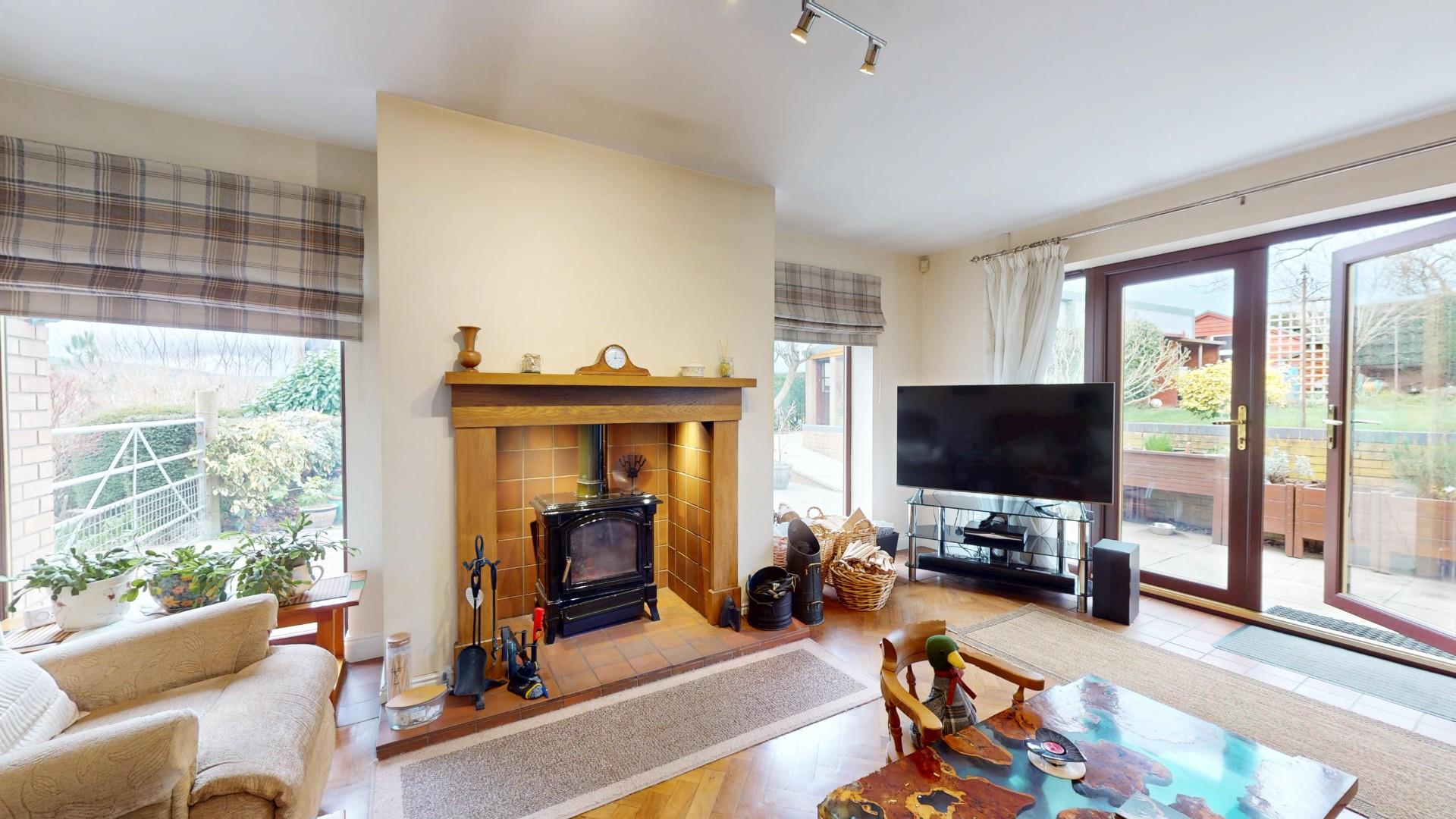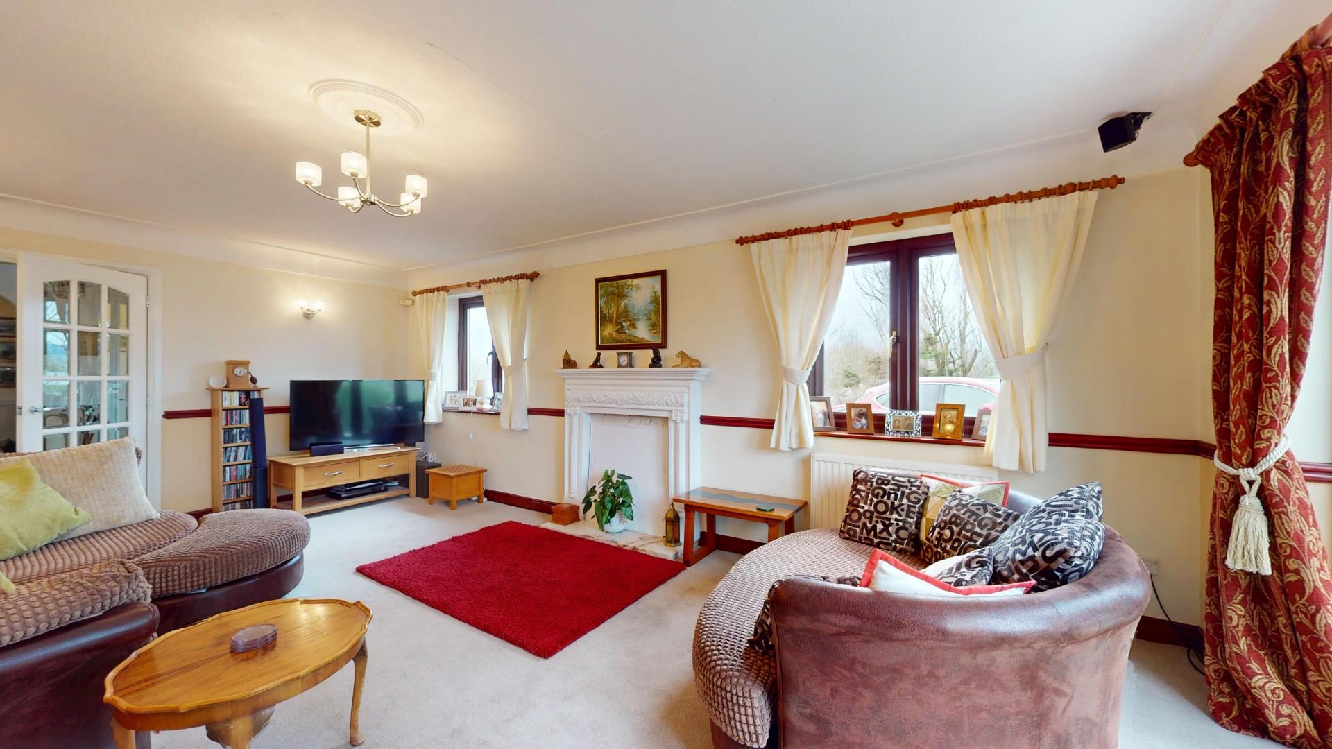 Approached by two Georgian style double glazed doors, it is a light and airy room with two double glazed windows to front and a further double glazed French door with matching panels to either side leading to the west facing side patio garden. Adams style fireplace and hearth (flue not in use), deep coved ceiling, dado, TV point, two panelled radiators.
