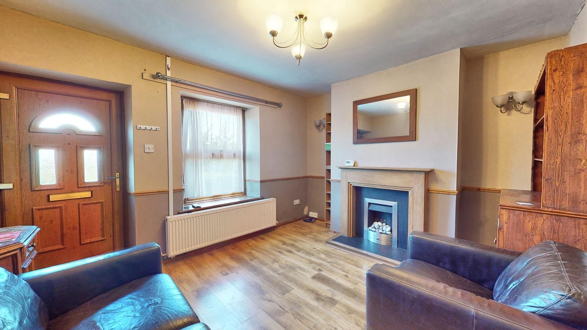 Modern double glazed window to the front with far reaching views across town towards rolling countryside. Adam style fireplace with slate insert and hearth, hardwood surround and a pebble coal effect living flame gas fire. Dado rail, tv point, wood grain effect floor covering and panelled radiator.