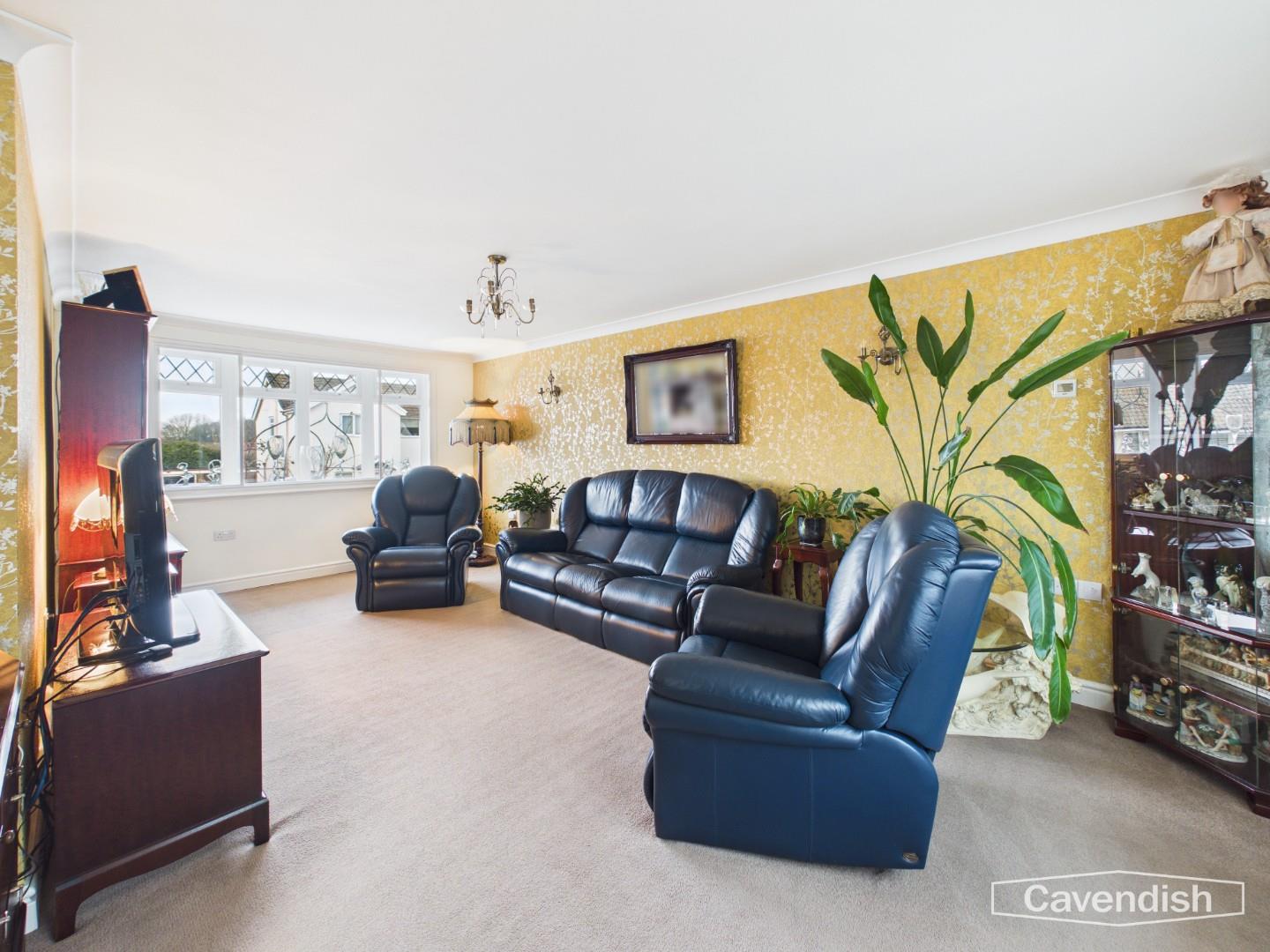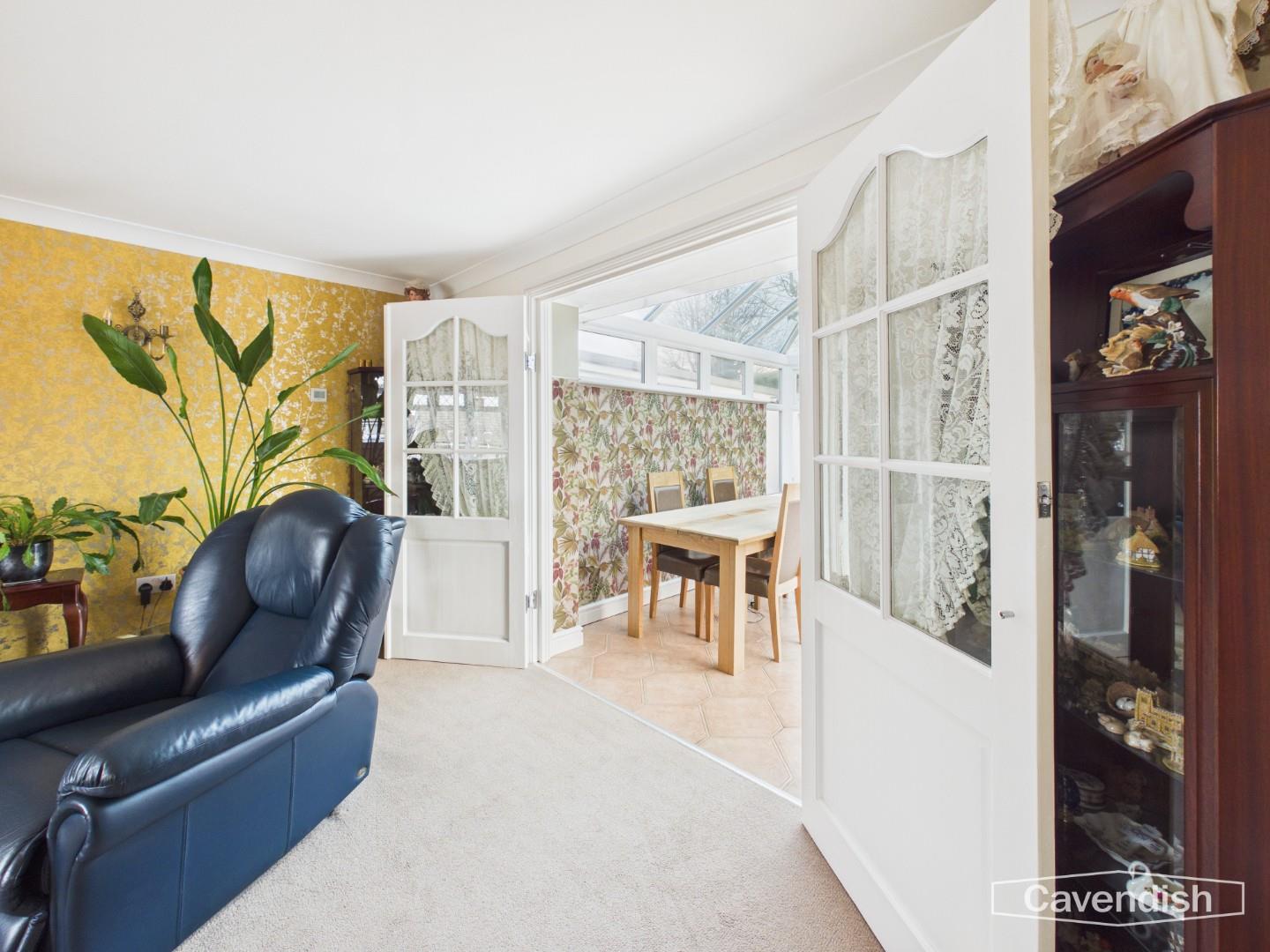 A spacious room with double and secondary glazed bow window to the front, TV aerial point, two wall light points, coved ceiling, electric underfloor heating and part glazed twin doors to conservatory.