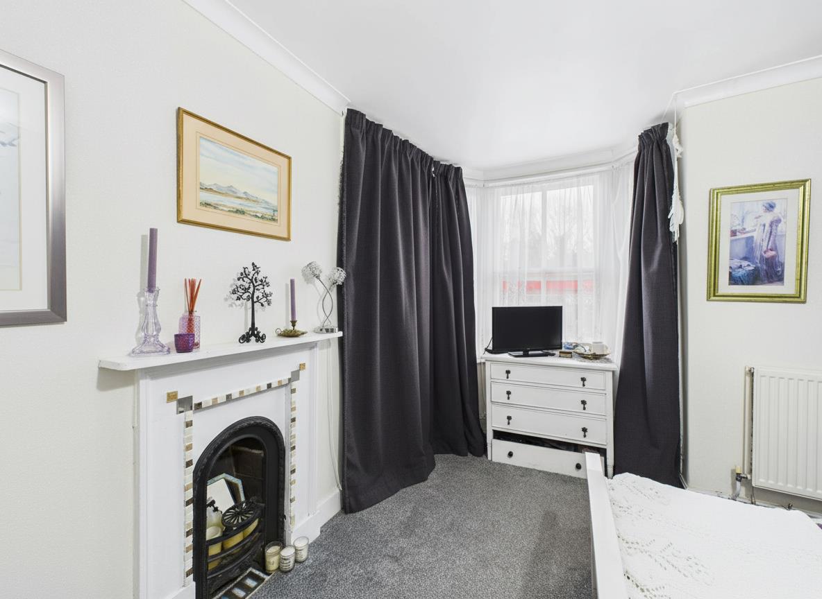A generous principal double bedroom located at the front of the property, featuring a bay window that fills the room with light. The original fireplace adds charm and character, creating a calm and comfortable main sleeping space.