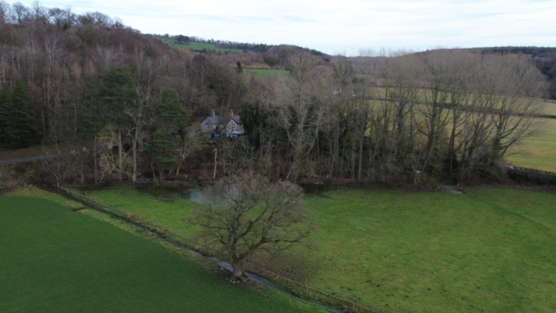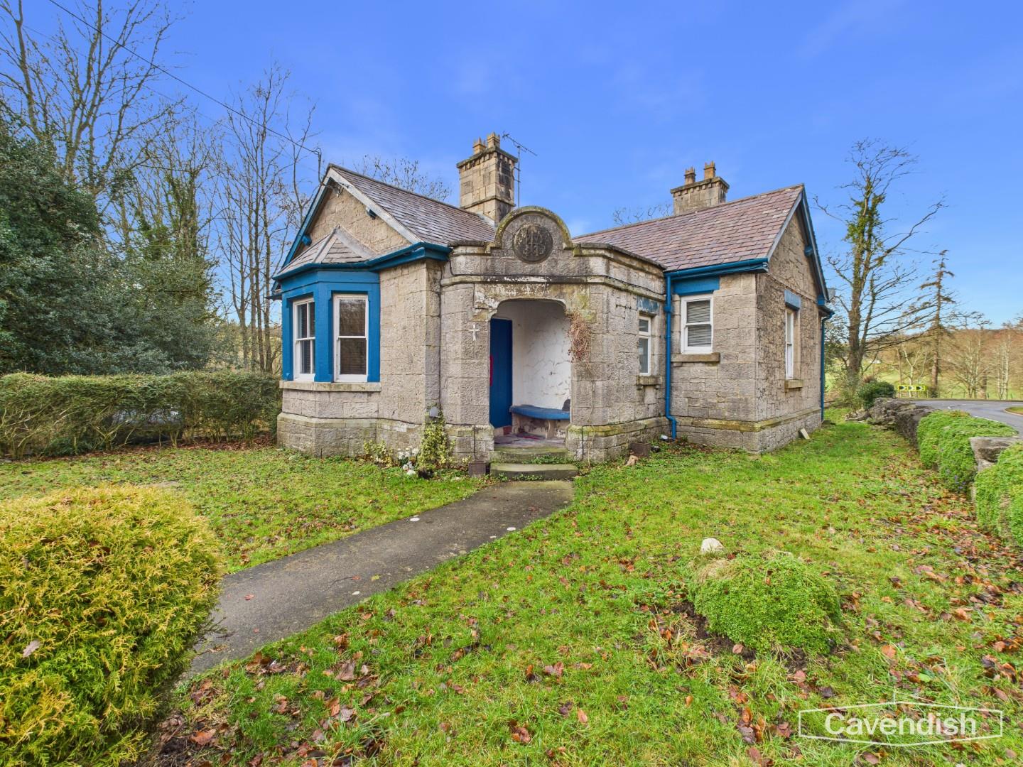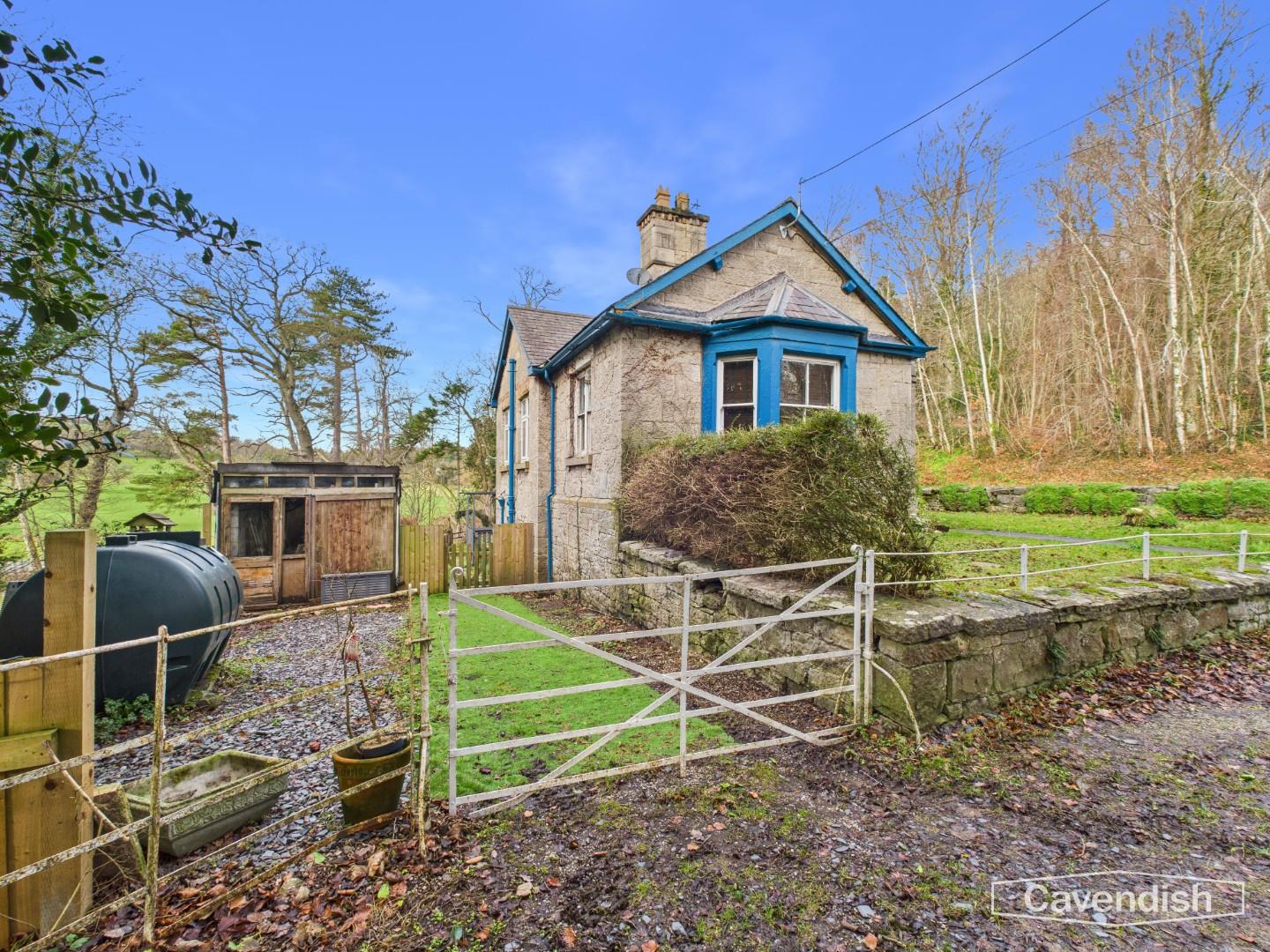 A character detached lodge set in gardens with a small woodland and enjoying beautiful views towards the Penbedw Estate, near Nannerch. The Penbedwr Estate was formerly owned by William Barber Buddicom, an established railway engineer, and the porch to the lodge still features a round tablet with the Buddicom monogram ‘WMB’ in raised letters. The property is a stone built single storey lodge with a basement and offers tremendous potential to improve and enhance. The accommodation briefly comprises: entrance porch with bench seat and quarry tile floor, living room with bay window overlooking the front and open fireplace, store room/small study, inner hallway, kitchen, bedroom one with exposed floorboards and built-in storage cupboards, bedroom two and a spacious bathroom with shower over the bath. The property benefits from oil fired central heating. Mold Lodge occupies a generous size plot extending to approximately 0.82 acres and is set within lawned gardens with driveway parking at the side and a woodland area. The property enjoys spectacular views to the rear over surrounding countryside and is located within the Clwydian Range & Dee Valley Area of Outstanding Natural Beauty (AONB). There is no onward chain involved in the sale of this property. The property would benefit from some updating and would make an ideal project for those looking to create a unique rural home.
